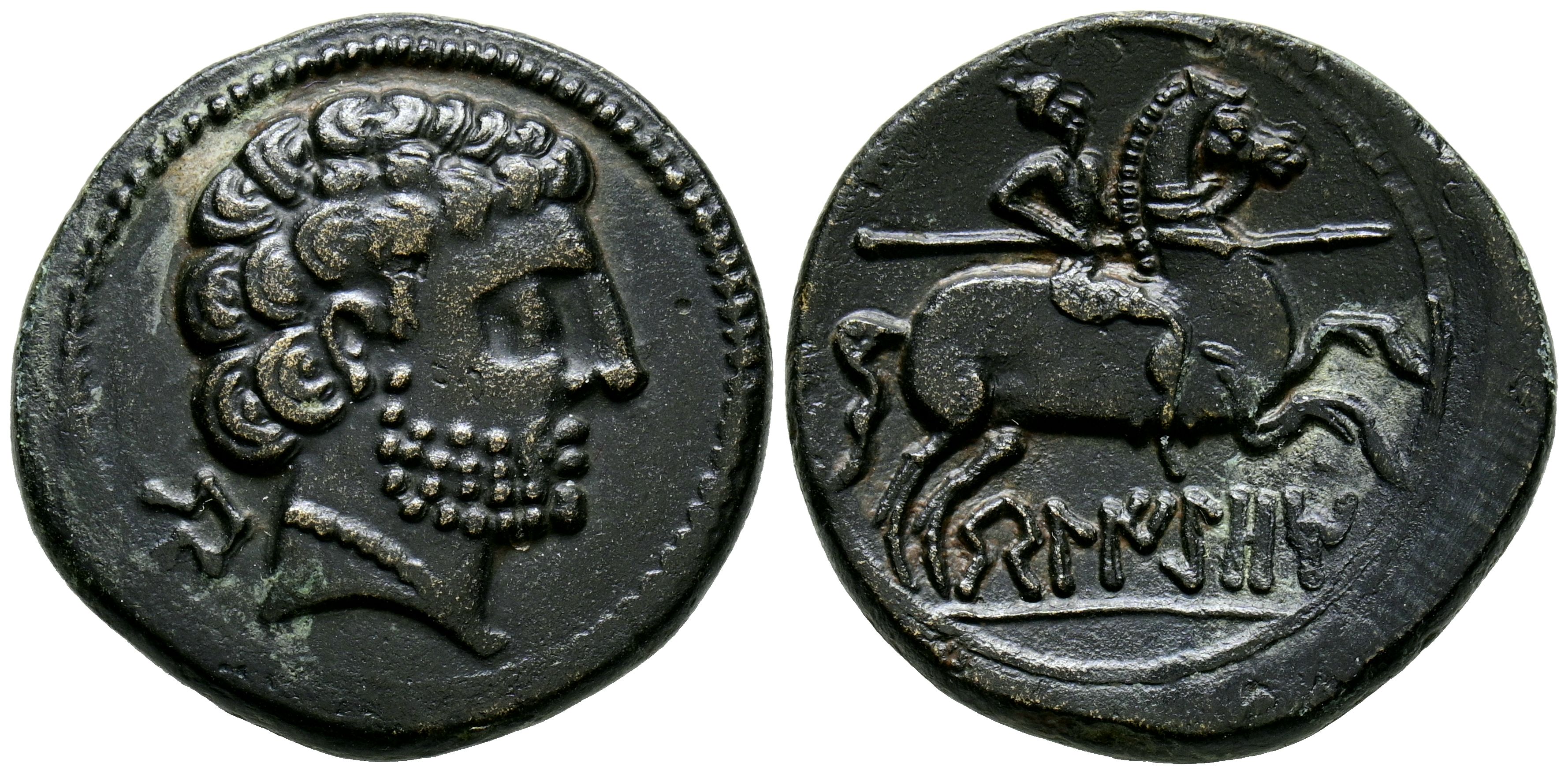 English BELIGIOM (Belchite, Zaragoza). As. (Ae. 8.79g/25mm). 120-20 Fine (FAB-243). Anv: Bearded male head facing right, behind Iberian letter: Be. Rev: Horseman with lance facing right, below Iberian legend: BeLIGiOM. VF+.