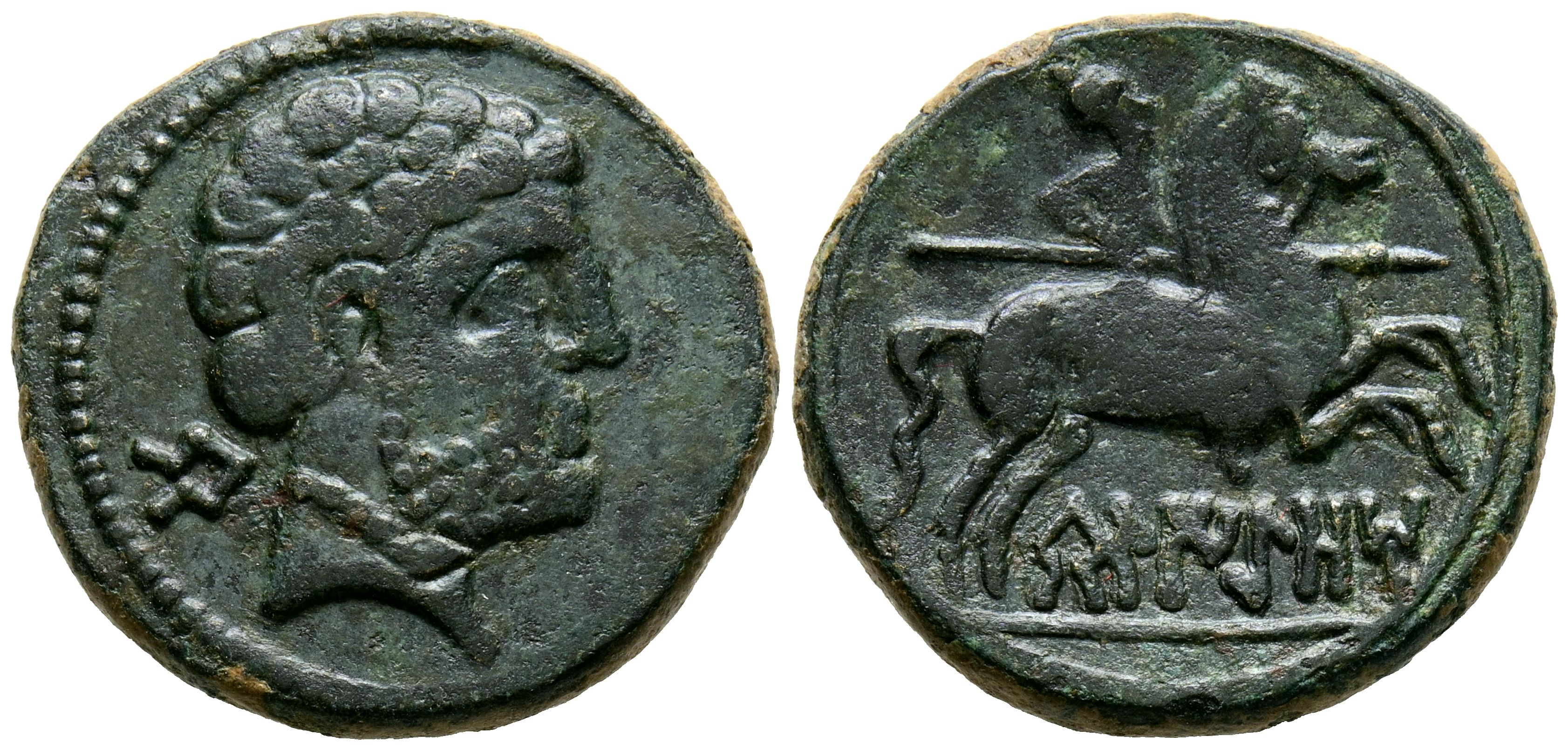 BELIGIOM (Belchite, Zaragoza). As. (Ae. 7.93g/24mm). 120-20 Fine (FAB-243). Anv: Bearded male head to right, behind Iberian letter: Be. Rev: Horseman with lance to right, below Iberian legend: BeLIGiOM. VF.