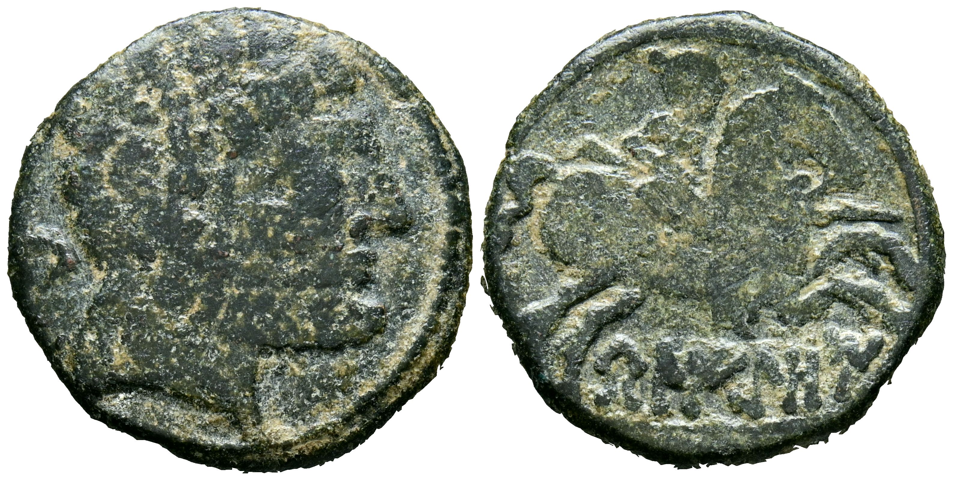 BELIGIOM (Belchite, Zaragoza). As. (Ae. 10.67g/22mm). 120-20 Fine (FAB-243). Anv: Bearded male head facing right, behind Iberian letter: Be. Rev: Horseman with lance facing right, below Iberian legend: BeLIGiOM. Good Fine.
