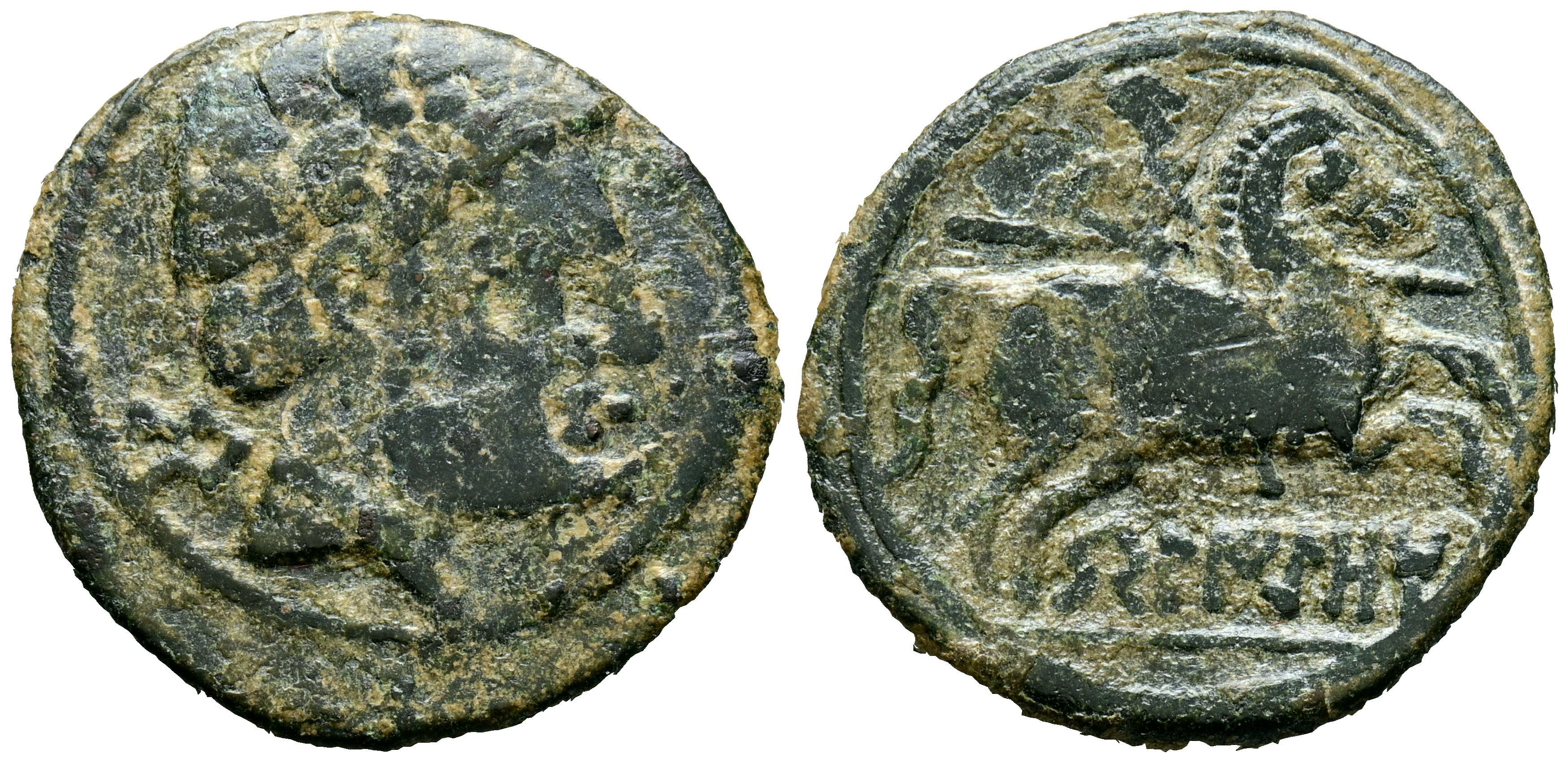 BELIGIOM (Belchite, Zaragoza). As. (Ae. 8.67g/25mm). 120-20 Fine (FAB-243). Anv: Bearded male head facing right, behind Iberian letter: Be. Rev: Horseman with lance facing right, below Iberian legend: BeLIGiOM. Good Fine.