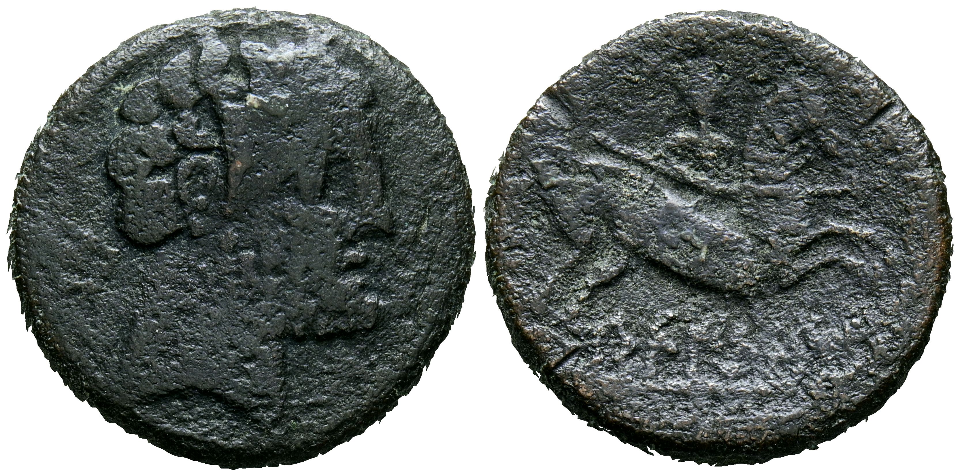BELIGIOM (Belchite, Zaragoza). As. (Ae. 9.71g/23mm). 120-20 Fine (FAB-243). Anv: Bearded male head facing right, behind Iberian letter: Be. Rev: Horseman with lance facing right, below Iberian legend: BeLIGiOM. Good Fine.