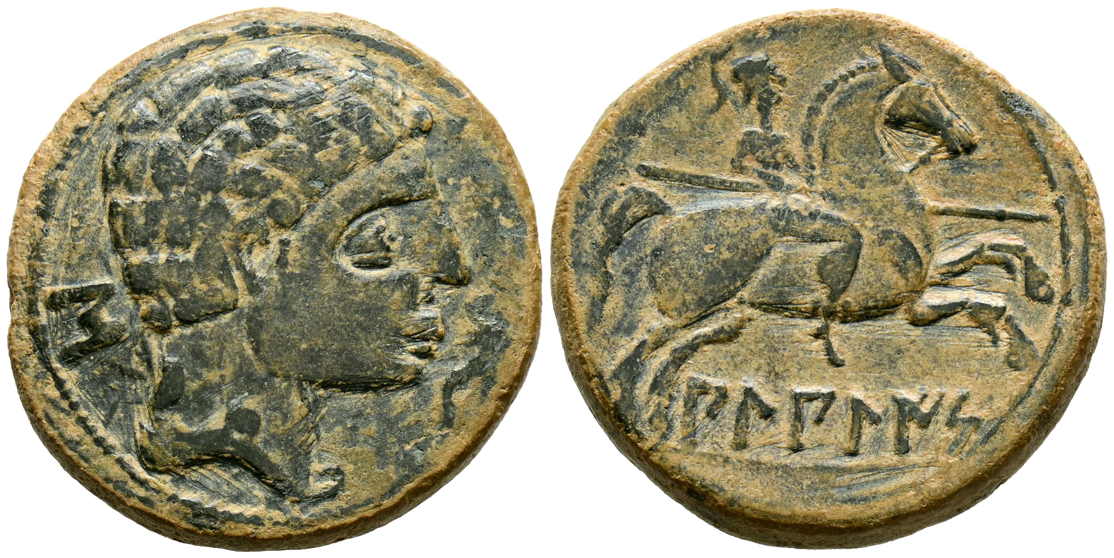 BILBILIS (Calatayud, Zaragoza). As. (Ae. 11.88g/27mm). 120-30 Fine (FAB-254). Obverse: Male head to right, behind letter S, in front dolphin. Reverse: Horseman with lance to right, below Iberian legend above line: BiLBiLIS. VF+.