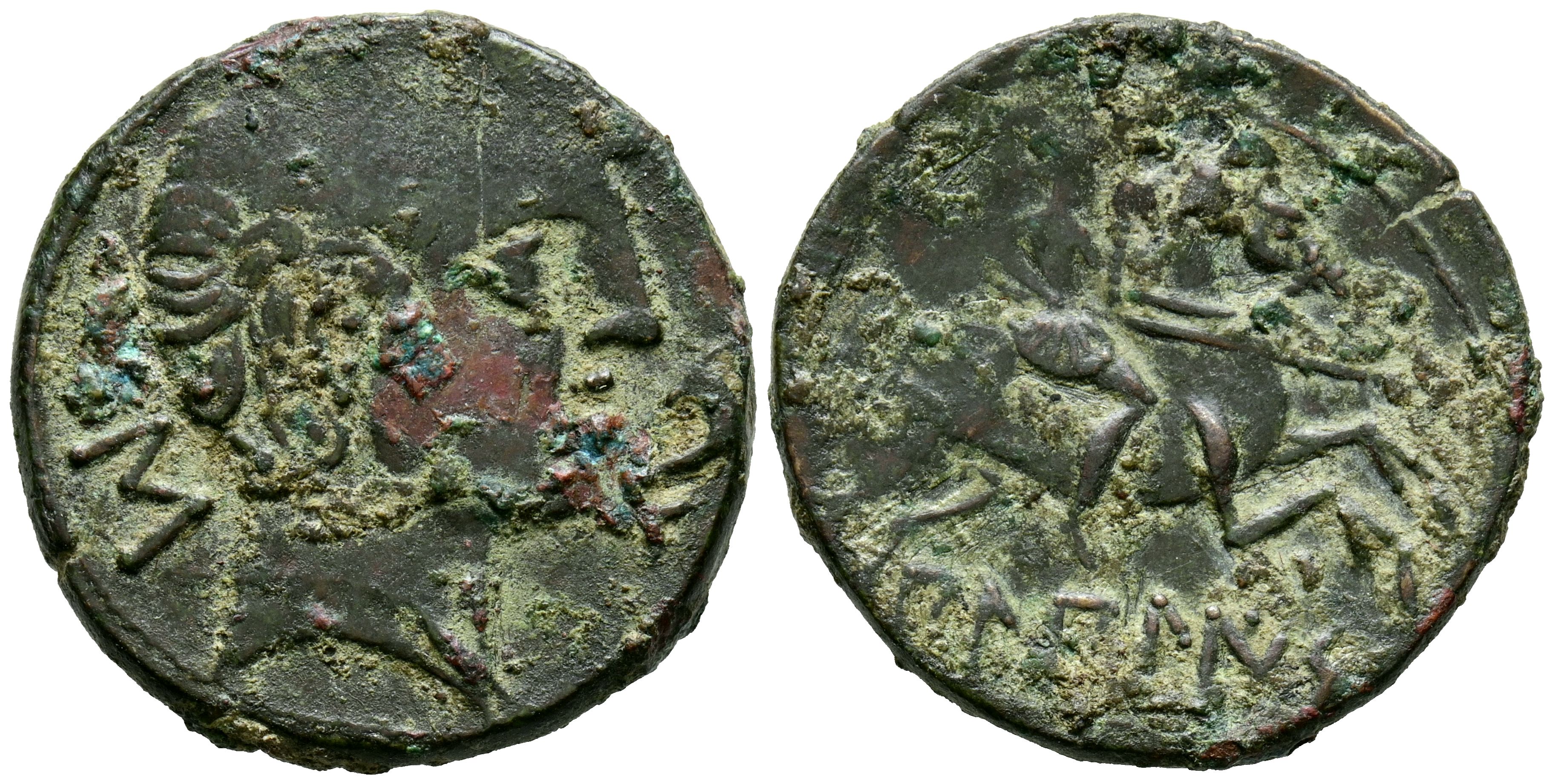 BILBILIS (Calatayud, Zaragoza). As. (Ae. 8.85g/25mm). 120-30 Fine (FAB-254). Anv: Male head right, behind letter S, in front dolphin. Rev: Horseman with lance right, below Iberian legend above line: BiLBiLIS. Good Fine.