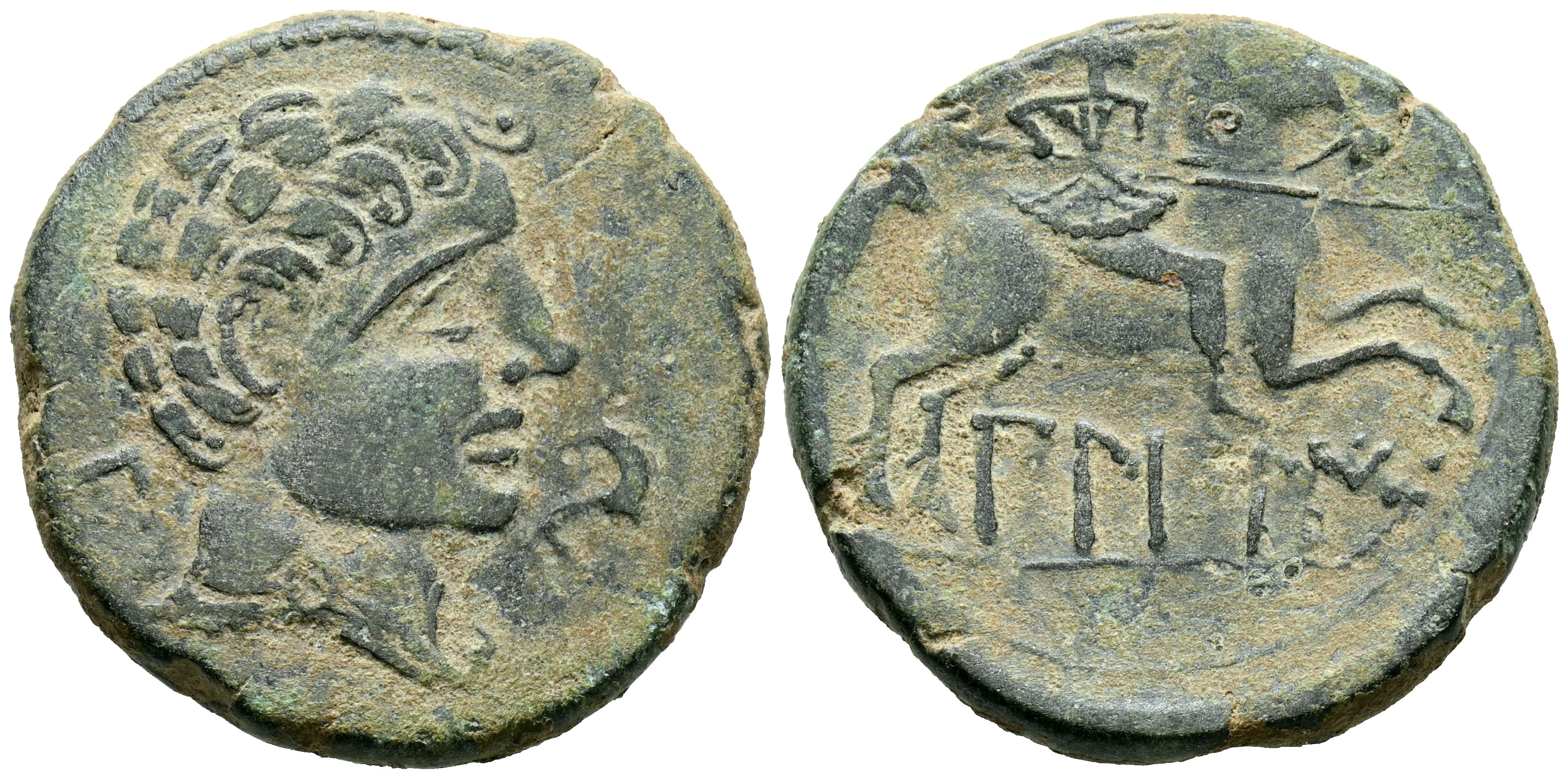 BILBILIS (Calatayud, Zaragoza). As. (Ae. 10.91g/26mm). 120-30 Fine (FAB-258). Anv: Male head facing right with neck ornaments, behind Iberian letter: Bi, in front dolphin. Rev: Horseman with lance facing right, below Iberian legend: BiLBiLIS. VF-.