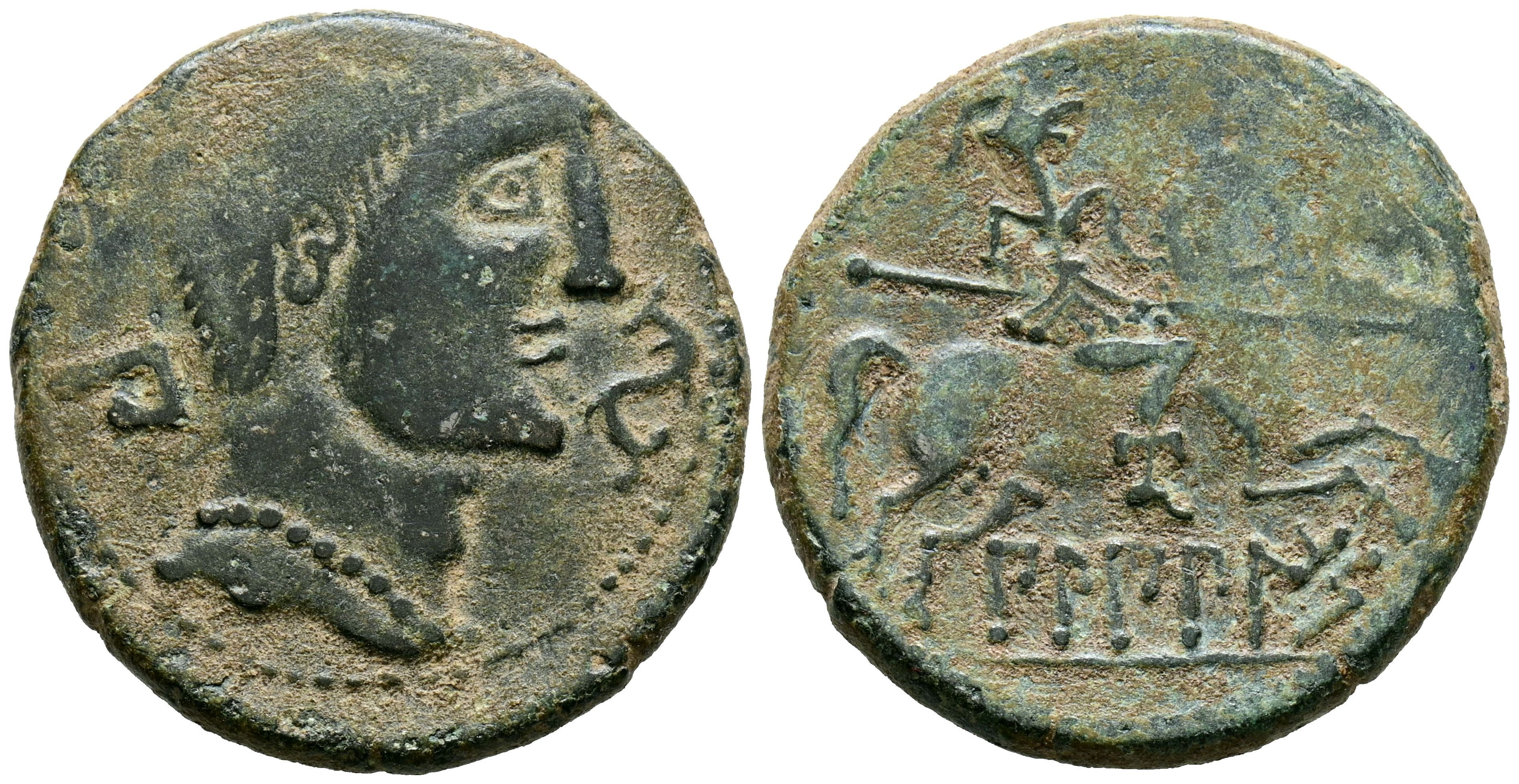 BILBILIS (Calatayud, Zaragoza). As. (Ae. 11.33g/26mm). 120-30 Fine (FAB-258). Anv: Male head facing right with neck ornaments, behind Iberian letter: Bi, in front dolphin. Rev: Horseman with lance facing right, below Iberian legend: BiLBiLIS. VF-.