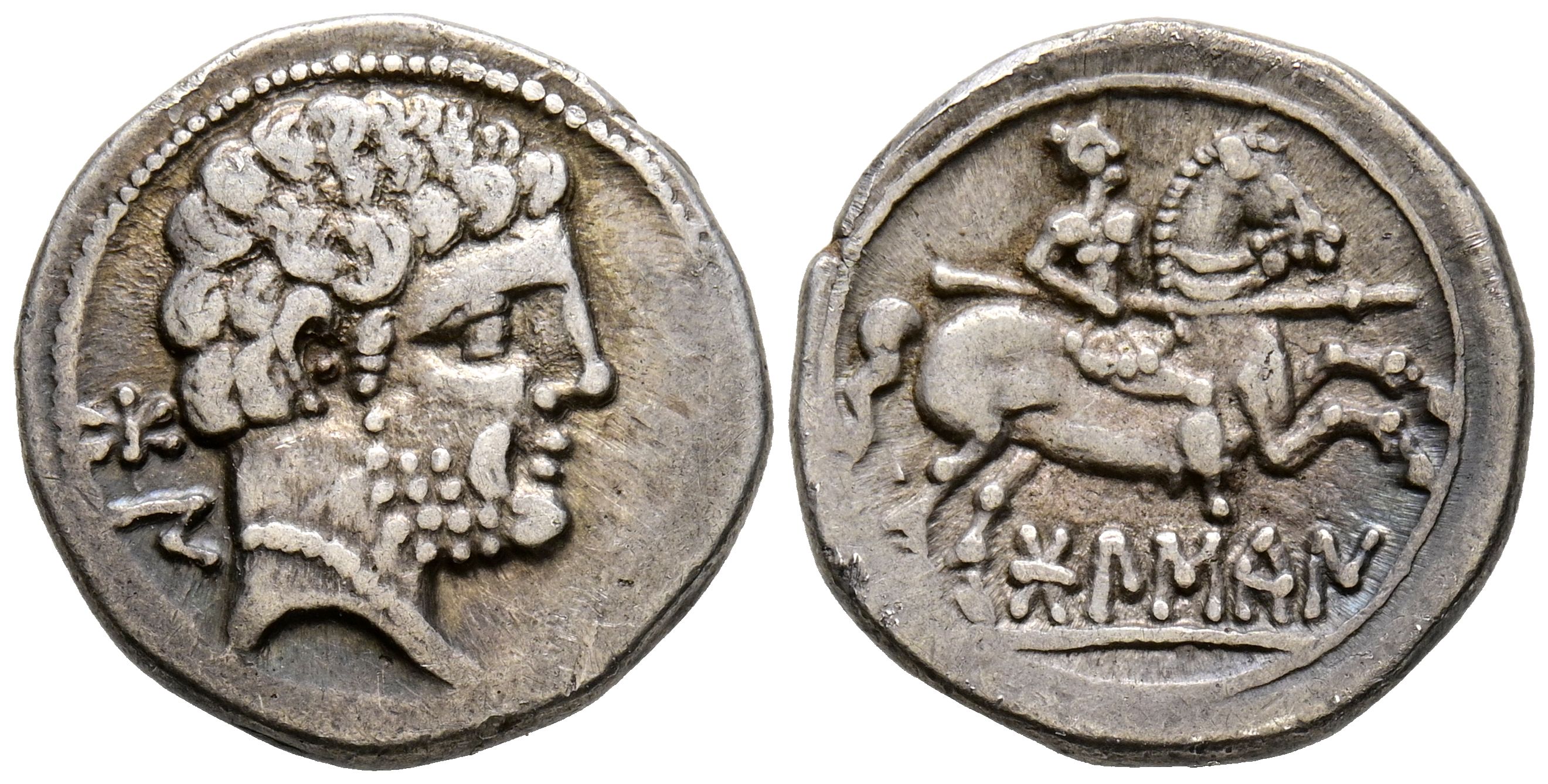 BOLSCAN (Huesca). Denarius. (Ar. 4.17g/19mm). 180-20 Fine (FAB-1911). Obv: Bearded male head to right, behind Iberian letters: BoN. Rev: Horseman with lance to right, below Iberian legend: BoLSCaN. VF+.