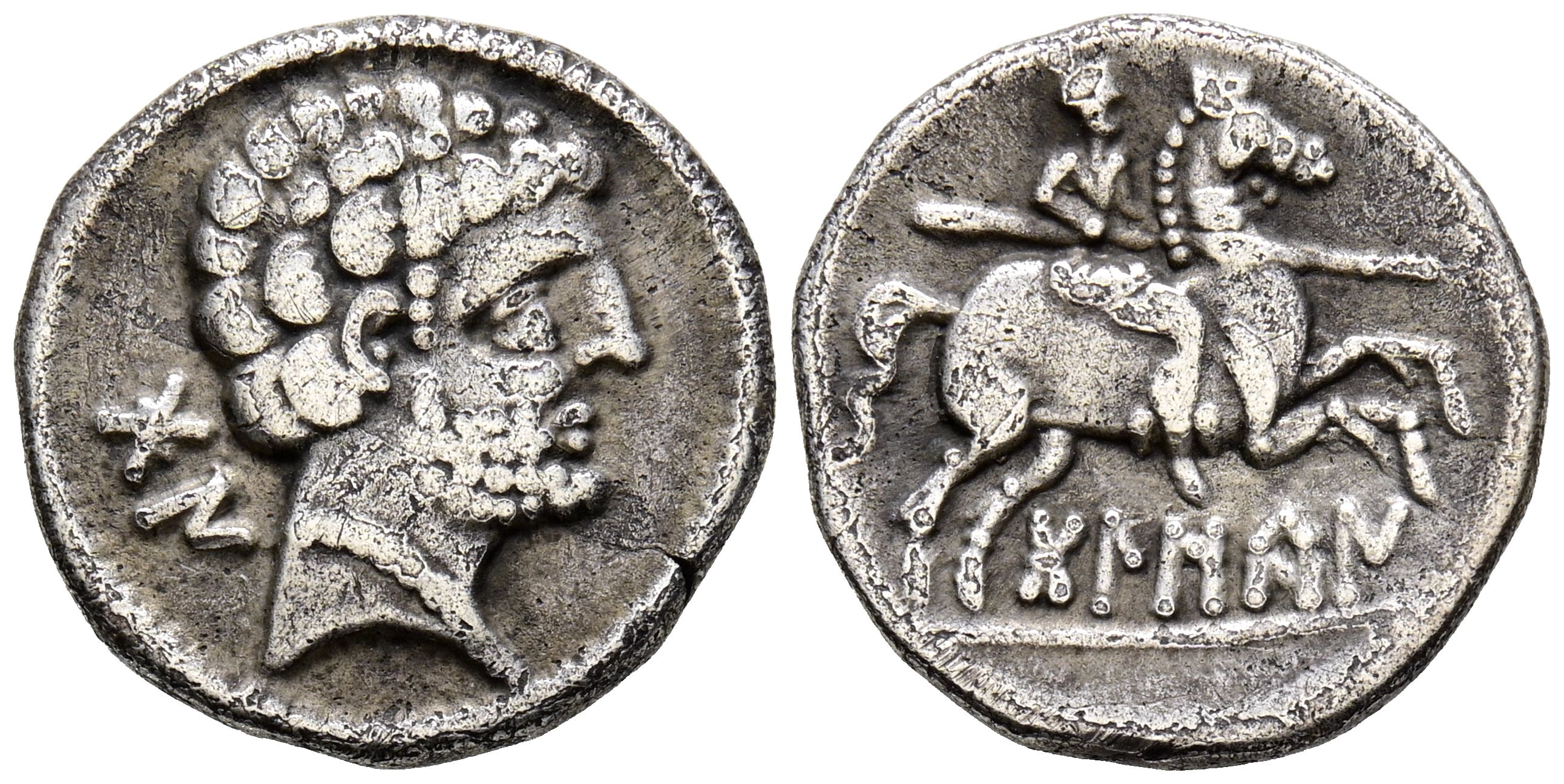 BOLSCAN (Huesca). Denarius. (Ar. 3.62g/18mm). 180-20 Fine (FAB-1911). Obv: Bearded male head to right, behind Iberian letters: BoN. Rev: Horseman with lance to right, below Iberian legend: BoLSCaN. VF-.