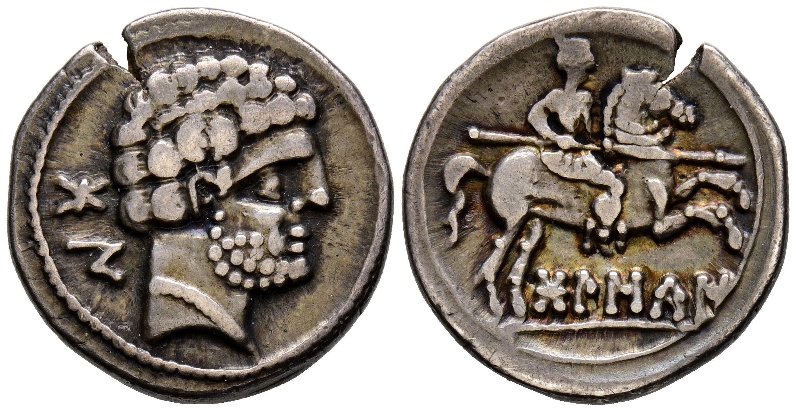 BOLSCAN (Huesca). Denarius. (Ar. 4.11g/20mm). 180-20 Fine (FAB-1911). Obv: Bearded male head to right, behind Iberian letters: BoN. Rev: Horseman with lance to right, below Iberian legend: BoLSCaN. VF-. Crack.