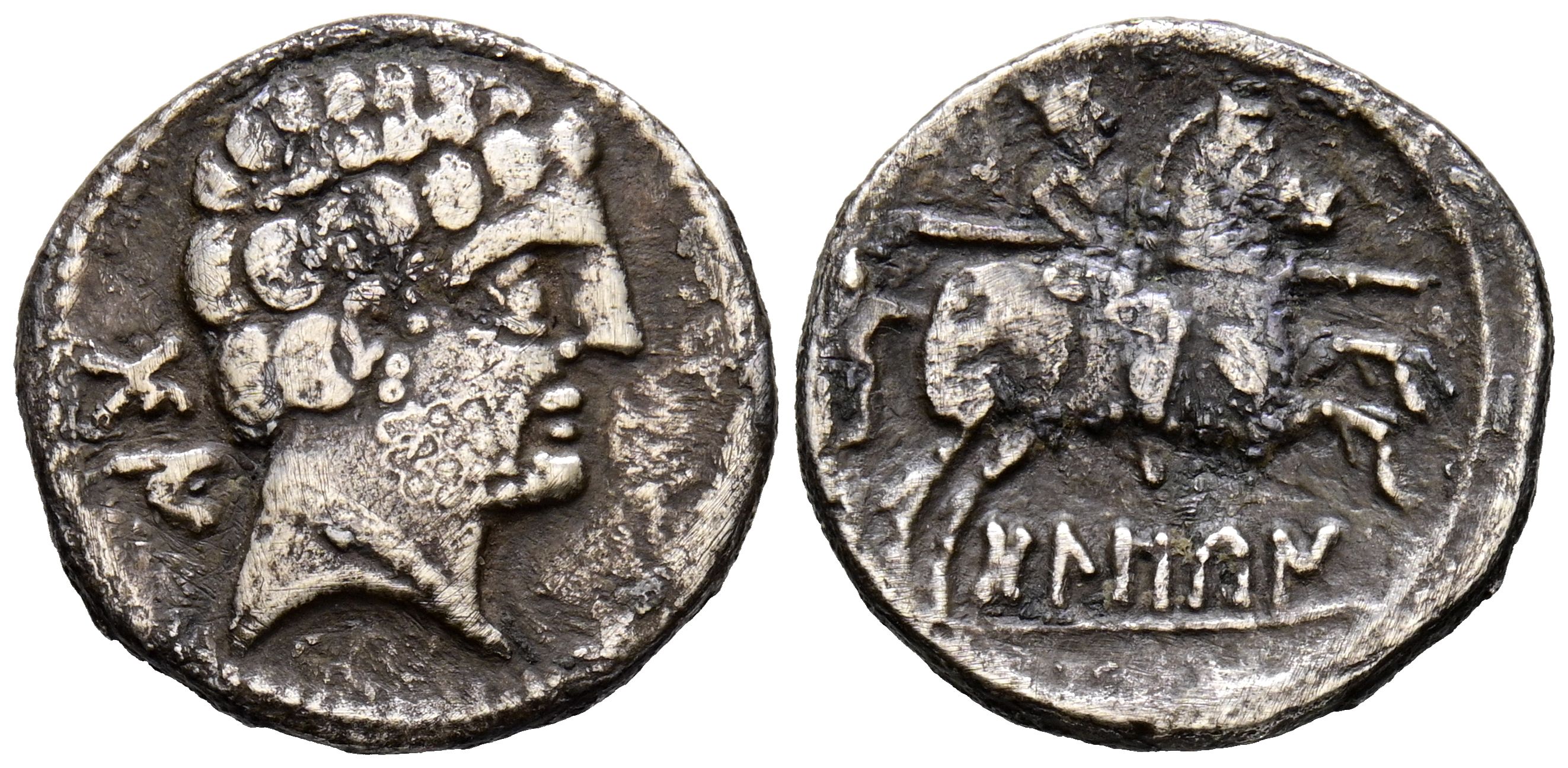 BOLSCAN (Huesca). Denarius. (Ar. 3.58g/18mm). 180-20 Fine (FAB-1911). Obv: Bearded male head to right, behind Iberian letters: BoN. Rev: Horseman with lance to right, below Iberian legend: BoLSCaN. Good Fine.