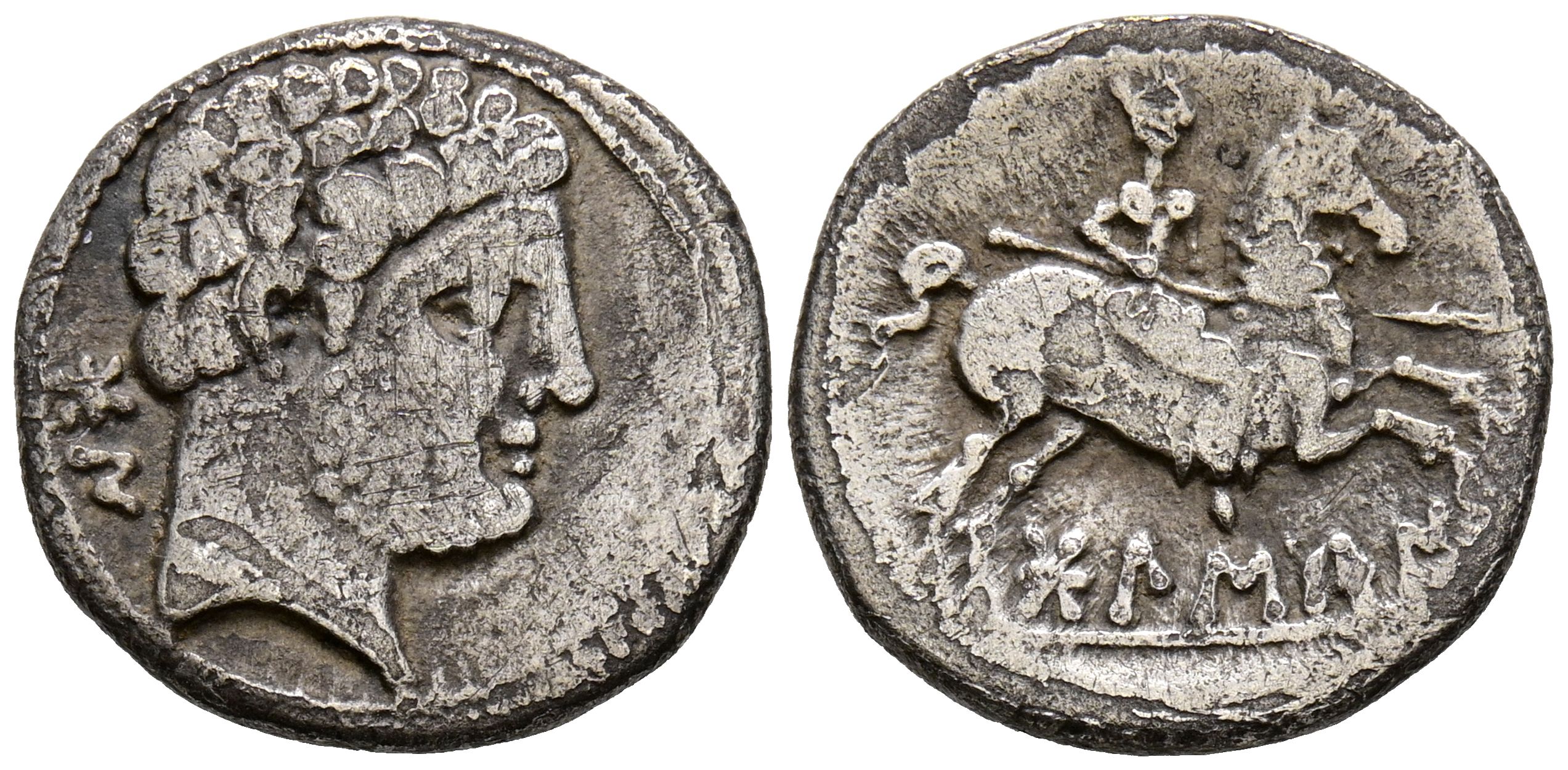 BOLSCAN (Huesca). Denarius. (Ar. 4.04g/18mm). 180-20 Fine (FAB-1911). Obv: Bearded male head to right, behind Iberian letters: BoN. Rev: Horseman with lance to right, below Iberian legend: BoLSCaN. Good Fine. Porous metal.