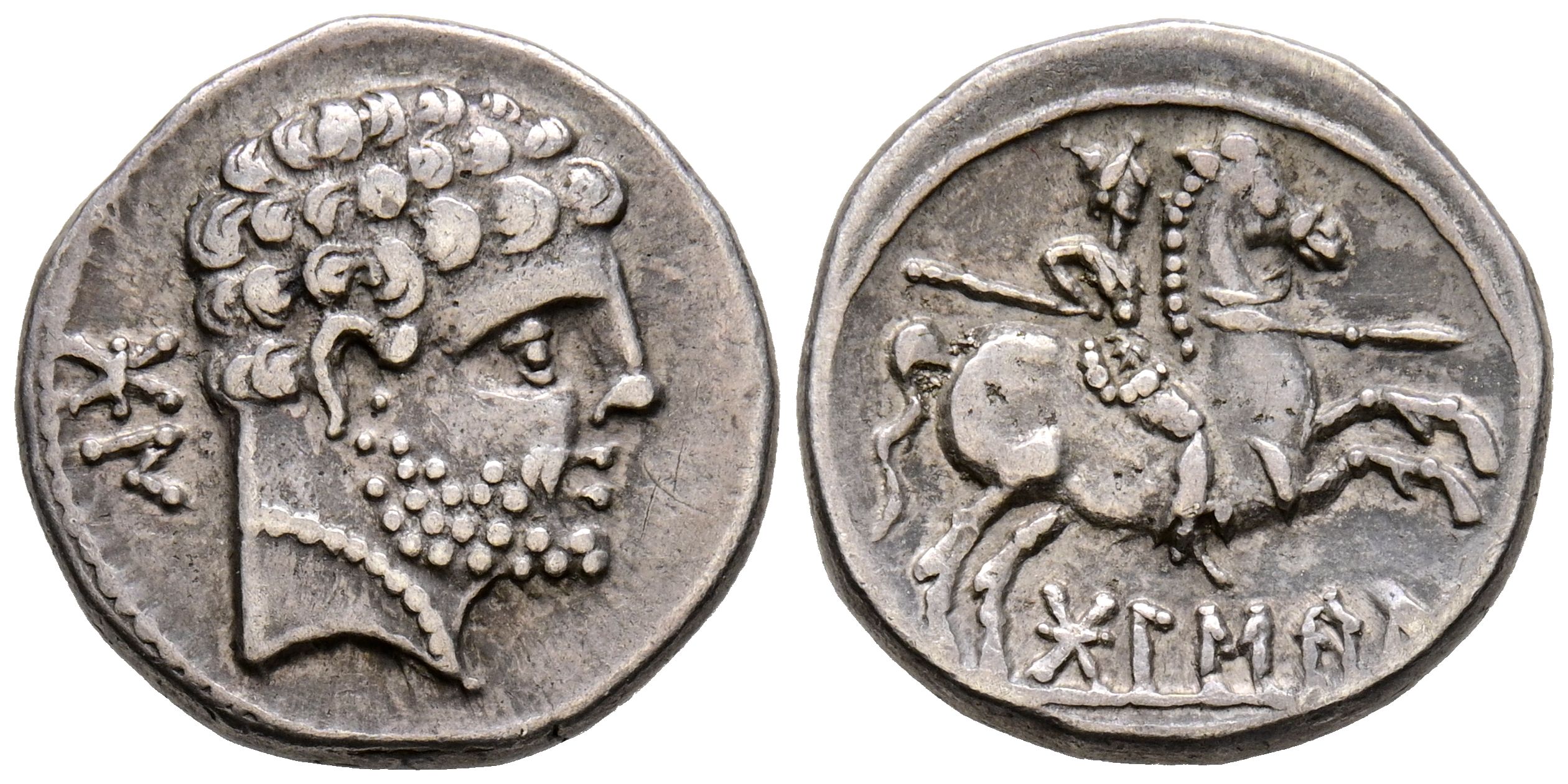English BOLSCAN (Huesca). Denarius. (Ar. 3.98g/17mm). 180-20 Fine (FAB-1911). Obv: Bearded male head to right, behind Iberian letters: BoN. Rev: Horseman with lance to right, below Iberian legend: BoLSCaN. VF+.