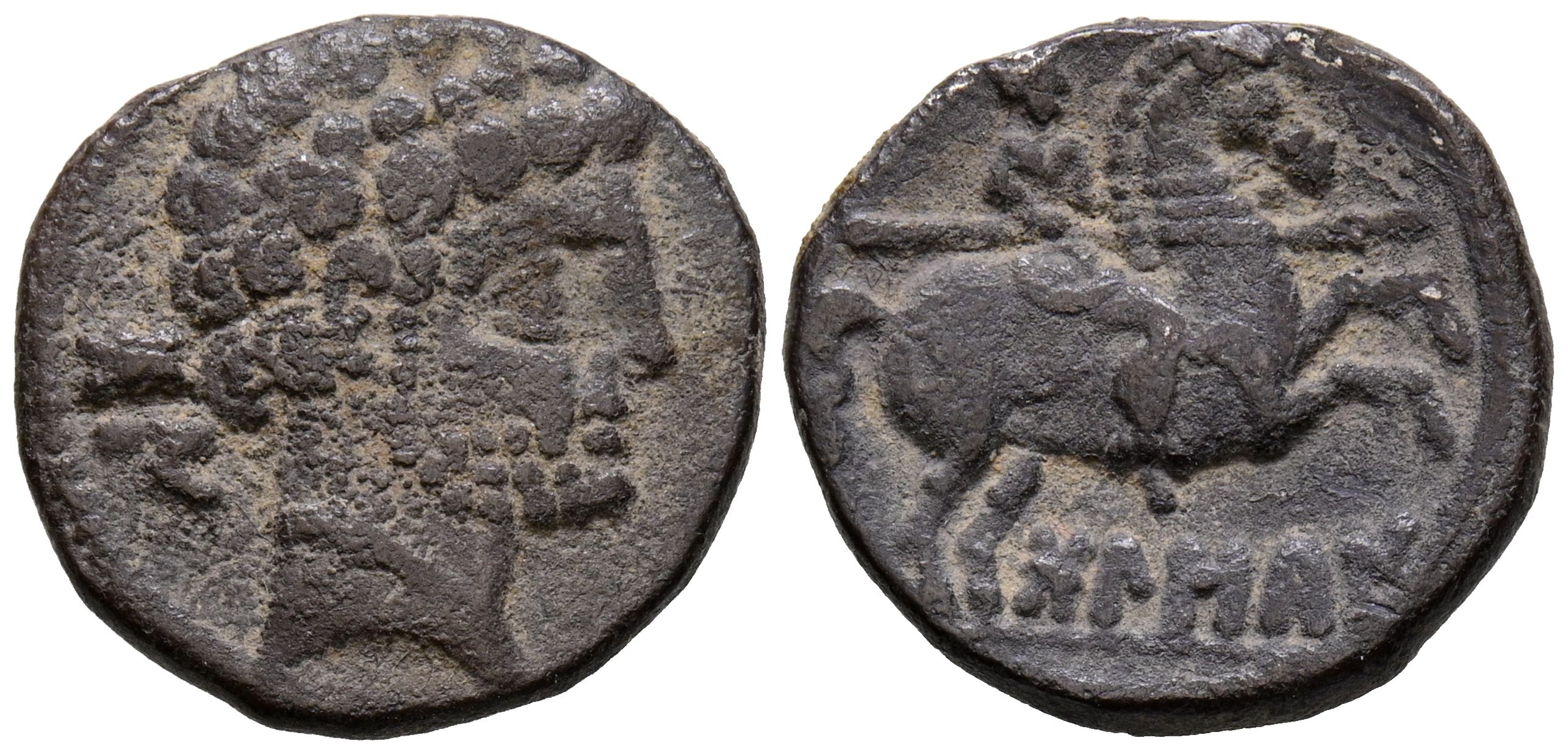 BOLSCAN (Huesca). Denarius. (Ar. 3.92g/18mm). 180-20 Fine (FAB-1911). Obv: Bearded male head to right, behind Iberian letters: BoN. Rev: Horseman with lance to right, below Iberian legend: BoLSCaN. Good Fine.