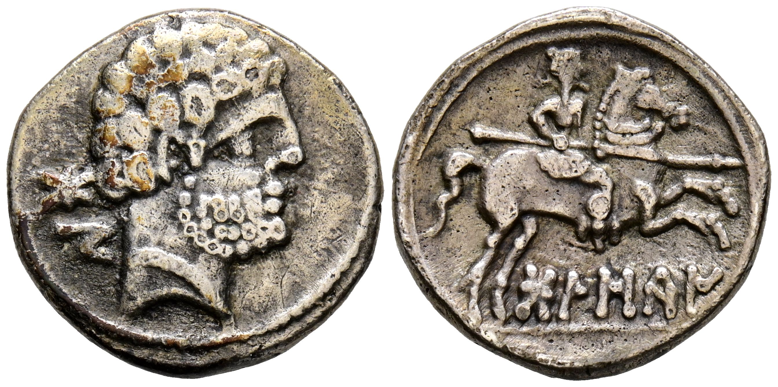 English BOLSCAN (Huesca). Denarius. (Ar. 3.66g/19mm). 180-20 Fine (FAB-1911). Obv: Bearded male head to right, behind Iberian letters: BoN. Rev: Horseman with lance to right, below Iberian legend: BoLSCaN. Very Fine-.