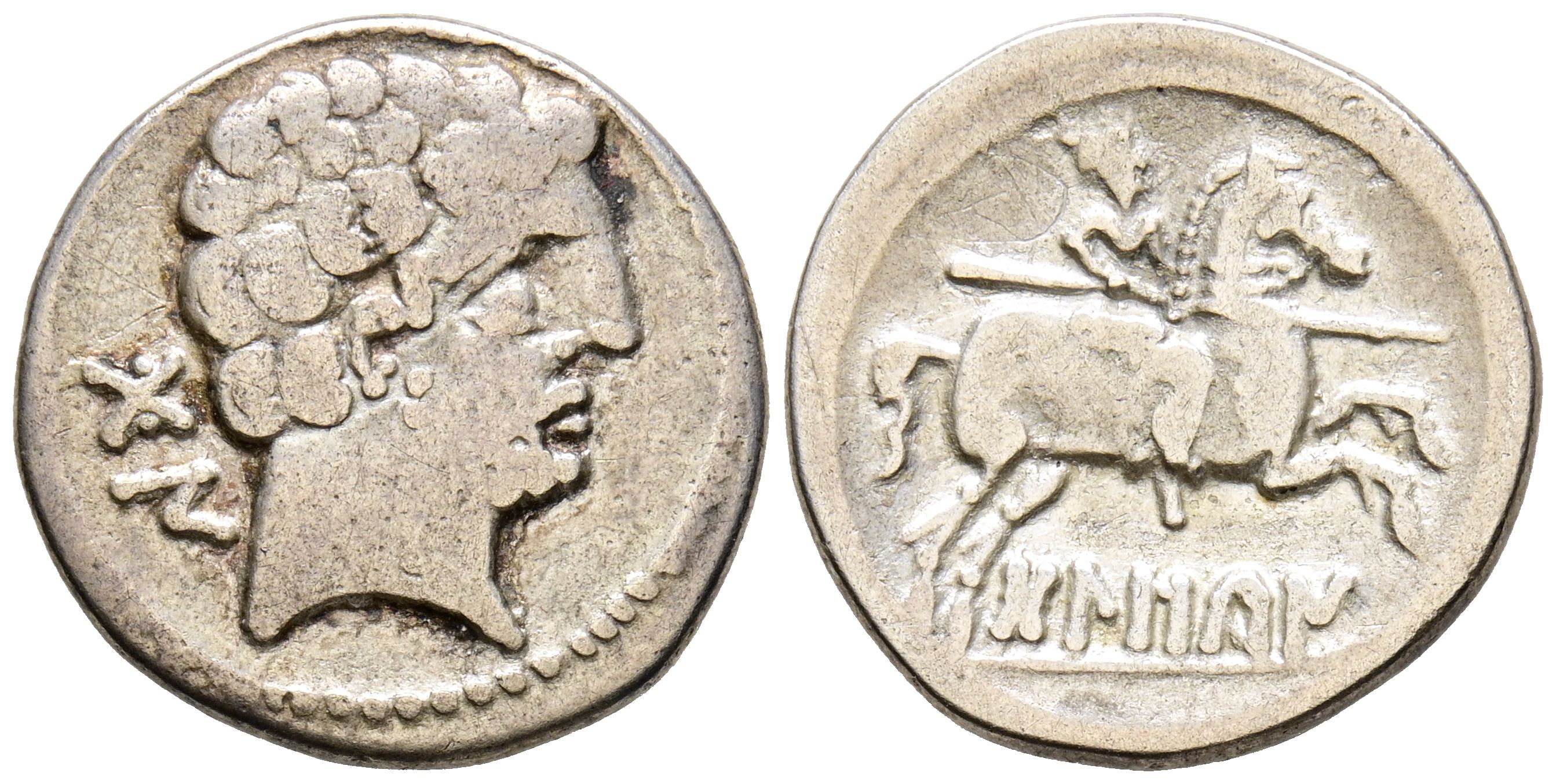BOLSCAN (Huesca). Denarius. (Ar. 3.88g/19mm). 180-20 Fine (FAB-1911). Obv: Bearded male head to right, behind Iberian letters: BoN. Rev: Horseman with lance to right, below Iberian legend: BoLSCaN. VF-.