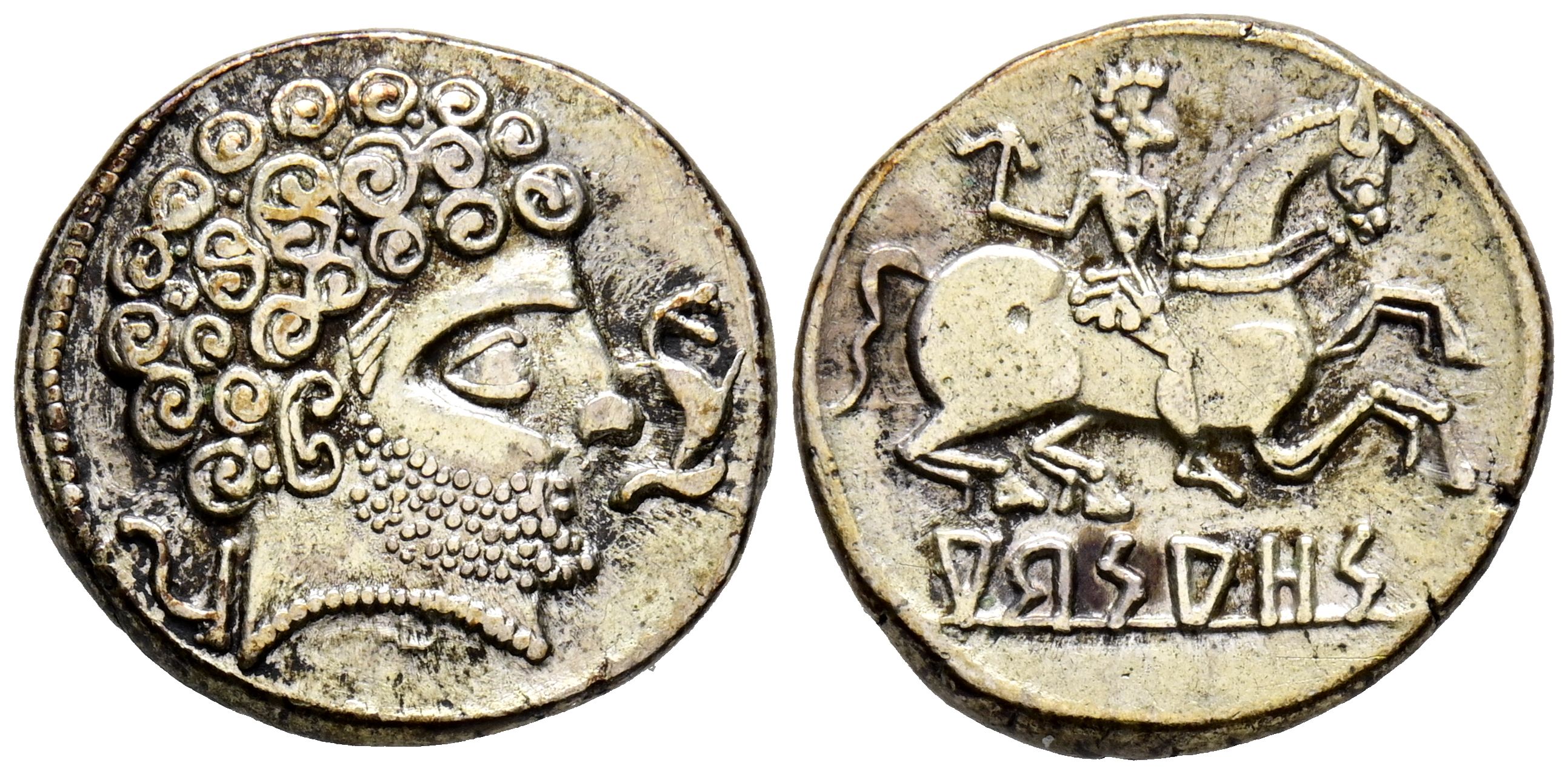 ARSAOS (Navarre area). Denarius. (Ar. 4.17g/18mm). 120-80 Fine (FAB-139). Obv: Bearded male head right, dolphin in front, plough behind. Reverse: Horseman with dart right, below Iberian legend above line: ARSAOS. VF+.