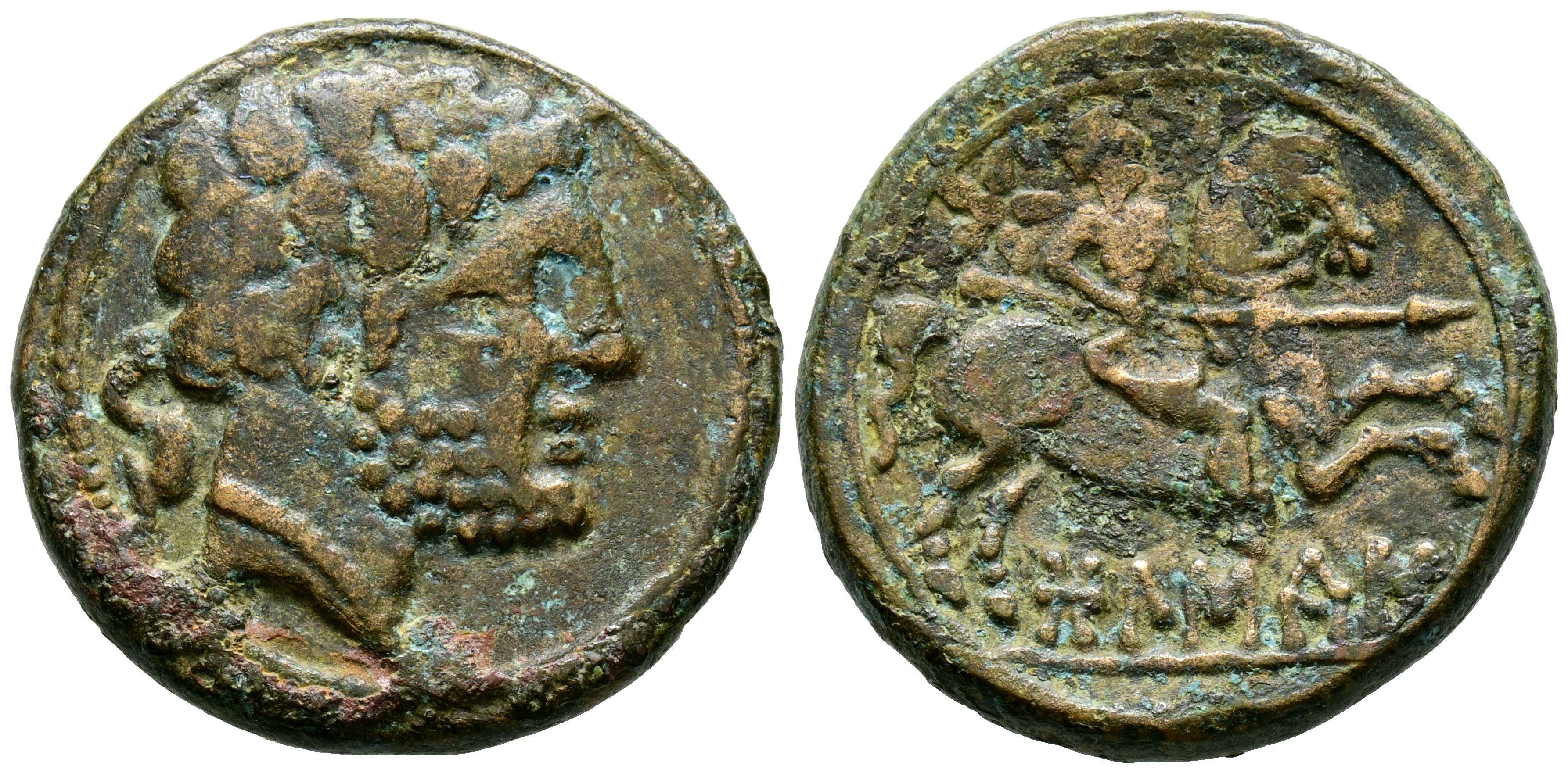 BOLSCAN (Huesca). As. (Ae. 9.75g/25mm). 180-20 Fine (FAB-1918). Obverse: Bearded male head to the right, behind a dolphin. Reverse: Horseman with lance to the right, above the star, below Iberian legend: BoLSCaN. VF.