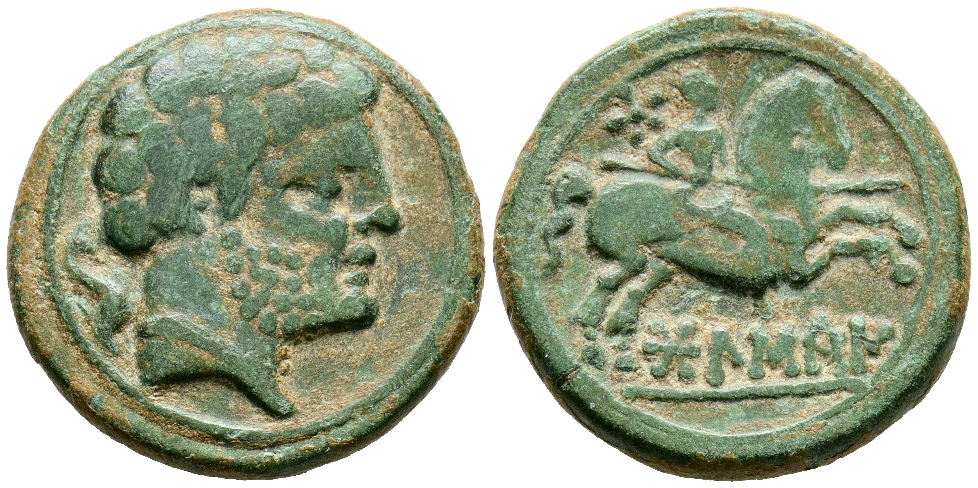 English BOLSCAN (Huesca). As. (Ae. 8.58g/24mm). 180-20 Fine (FAB-1918). Anv: Bearded male head to the right, behind a dolphin. Rev: Horseman with lance to the right, above the star, below Iberian legend: BoLSCaN. VF-.