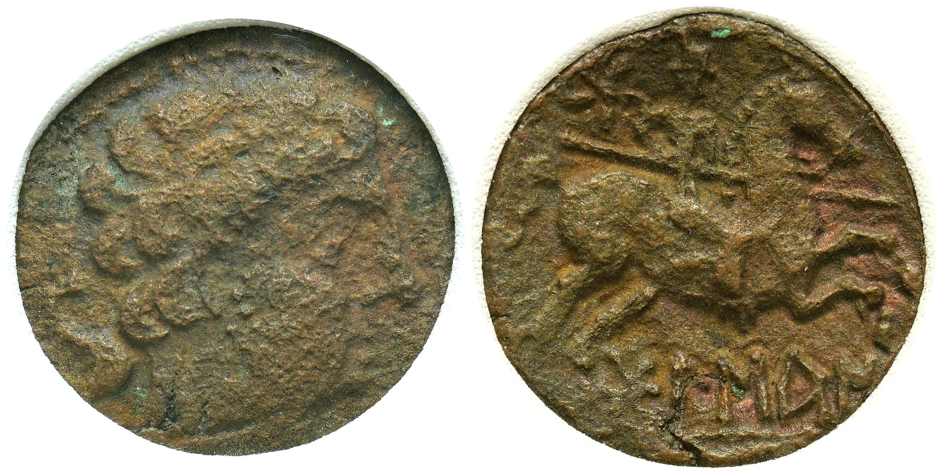 BOLSCAN (Huesca). As. (Ae. 6.82g/23mm)*. 180-20 Fine (FAB-1918). Anv: Bearded male head right, behind dolphin. Rev: Horseman with lance right, above star, below Iberian legend: BoLSCaN. Encapsulated by NNC XF40. *Theoretical weight and measurement.