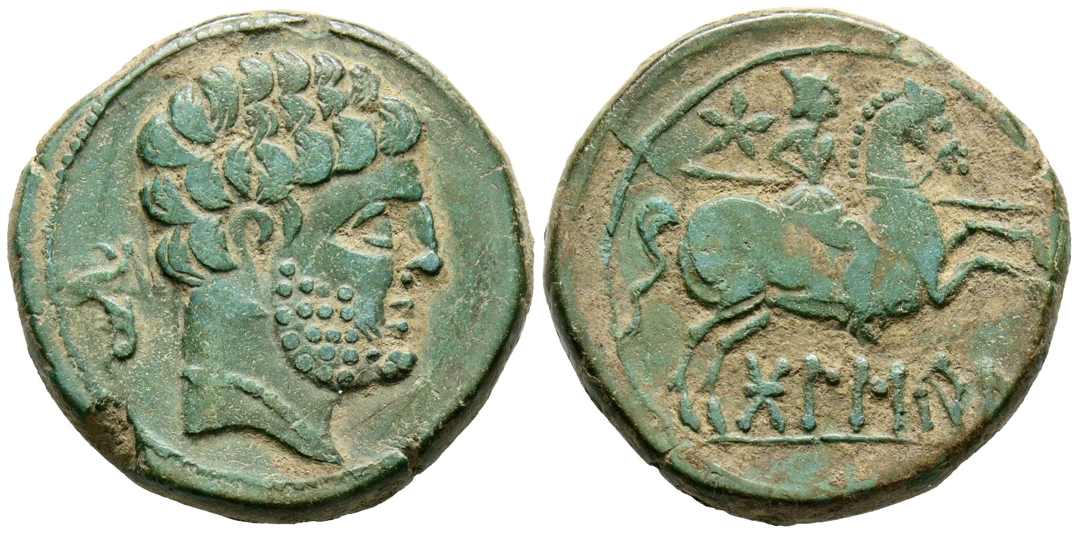 BOLSCAN (Huesca). As. (Ae. 9.19g/25mm). 180-20 Fine (FAB-1918). Obv: Bearded male head right, behind dolphin. Rev: Horseman with lance right, above star, below Iberian legend: BoLSCaN. VF. Green patina.