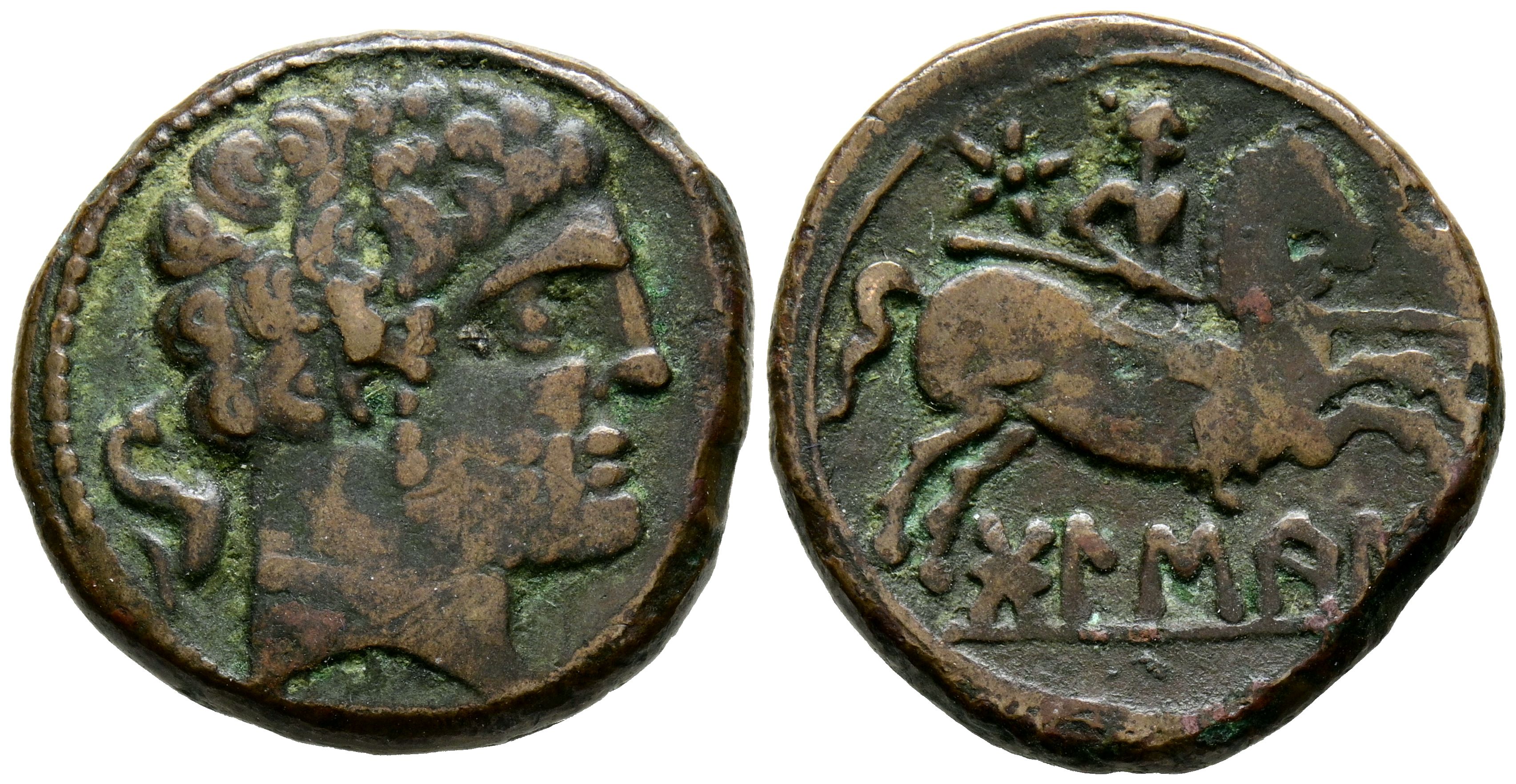 BOLSCAN (Huesca). As. (Ae. 9.98g/25mm). 180-20 Fine (FAB-1918). Anv: Bearded male head to right, behind a dolphin. Rev: Horseman with lance to right, star above, below Iberian legend: BoLSCaN. VF-.