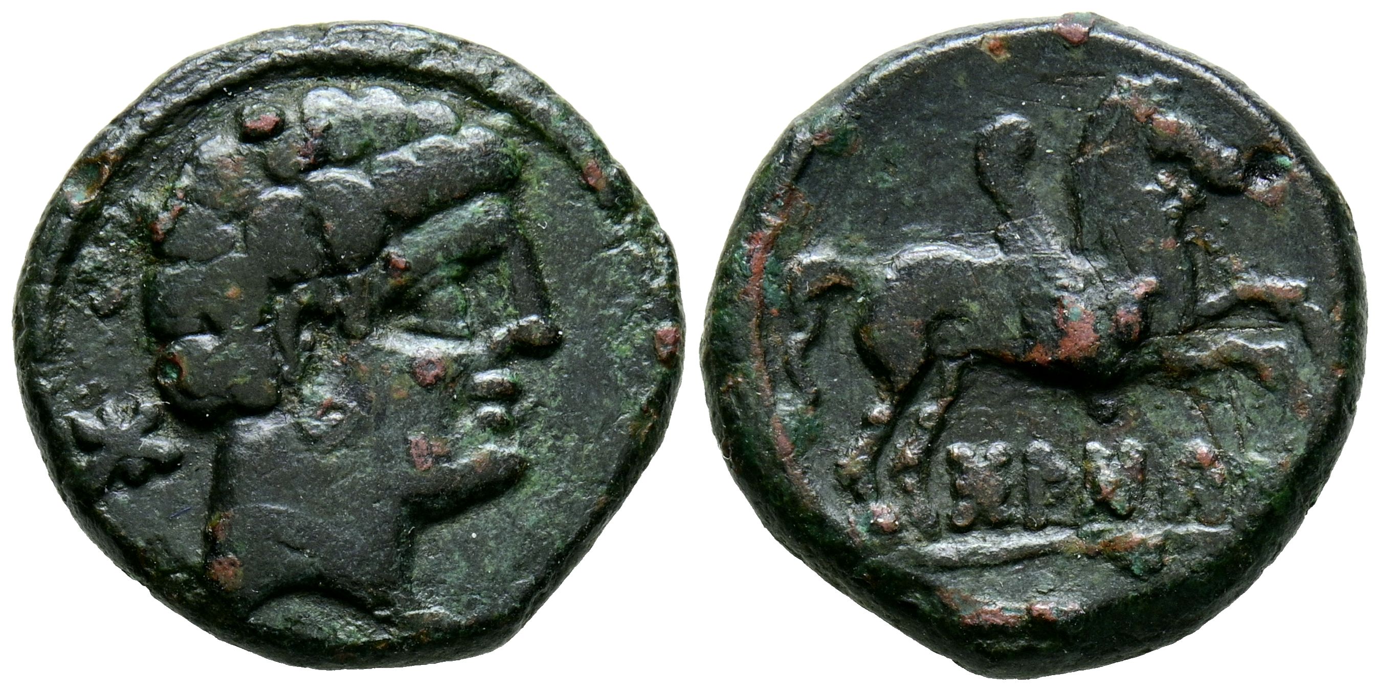 BOLSCAN (Huesca, Aragón). Semis. (Ae. 5.16g/19mm). 180-20 Fine (FAB-1921). Anv: Bearded head right, behind Iberian letter Bo. Rev: Pegasus right, below Iberian legend: BoLSCaN. Very Fine-.
