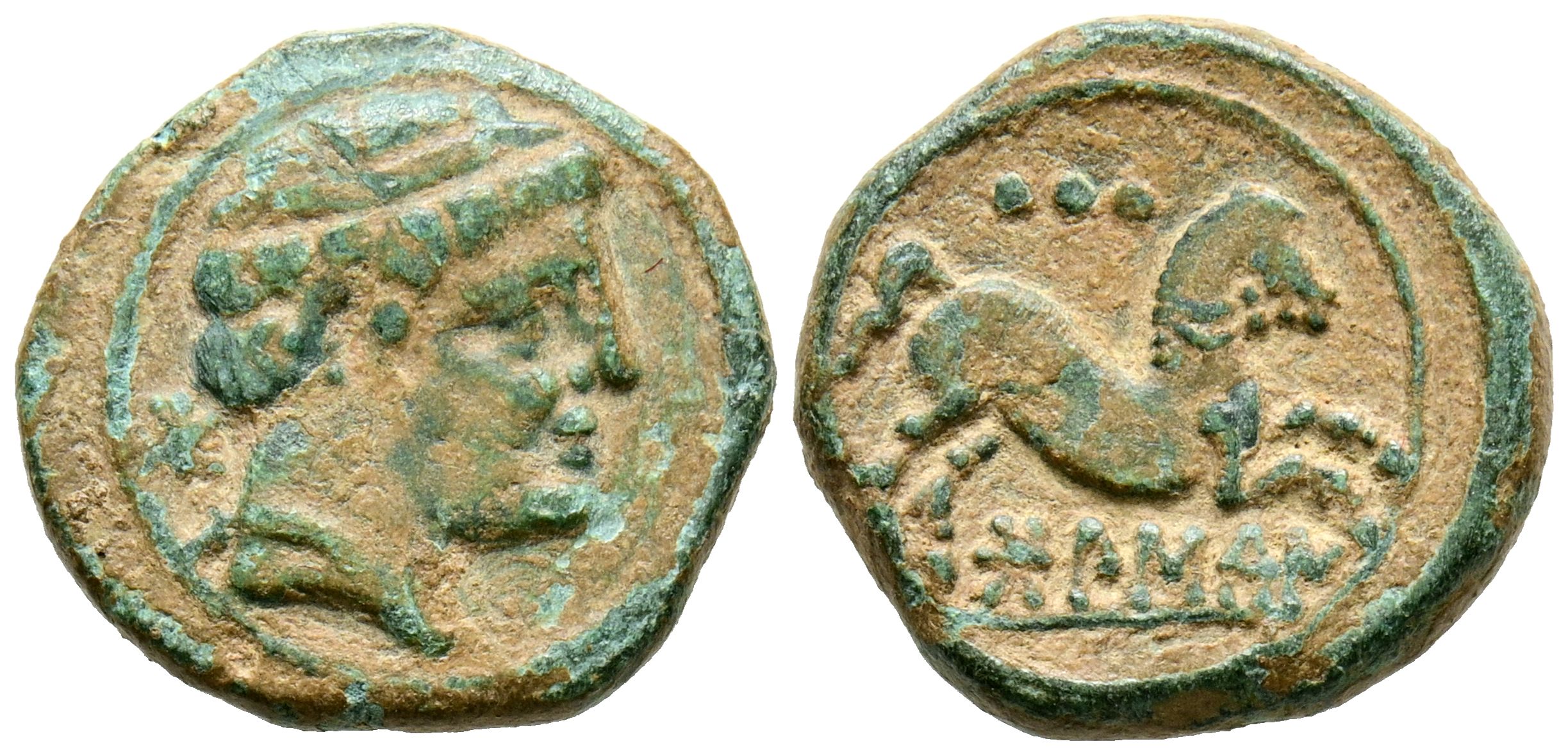 BOLSCAN (Huesca, Aragon). Quadrant. (Ae. 3.43g/17mm). 180-20 Fine (FAB-1922). Obverse: Diademed head to the right, behind Iberian letter Bo. Reverse: Horse leaping to the right, above three dots and below Iberian legend: BoLSCaN. VF.