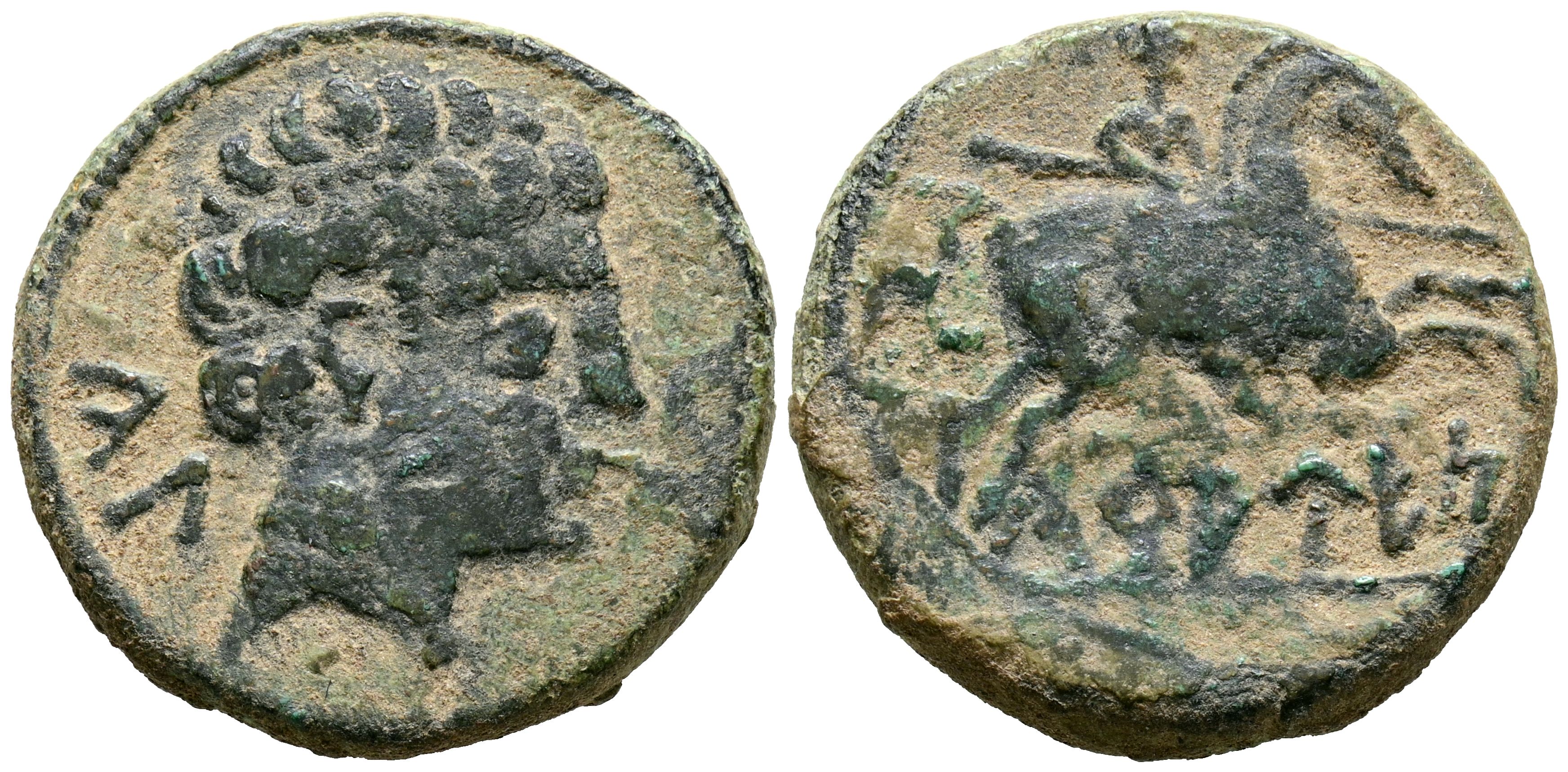 CARAUES (Magallón, Zaragoza). As. (Ae. 10.38g/24mm). 120-80 Fine (FAB-438). Anv: Male head to the right, behind letters: CaL, in front a dolphin. Rev: Horseman with lance to the right, below Iberian legend: CaRAUES. VF-. Rare specimen.