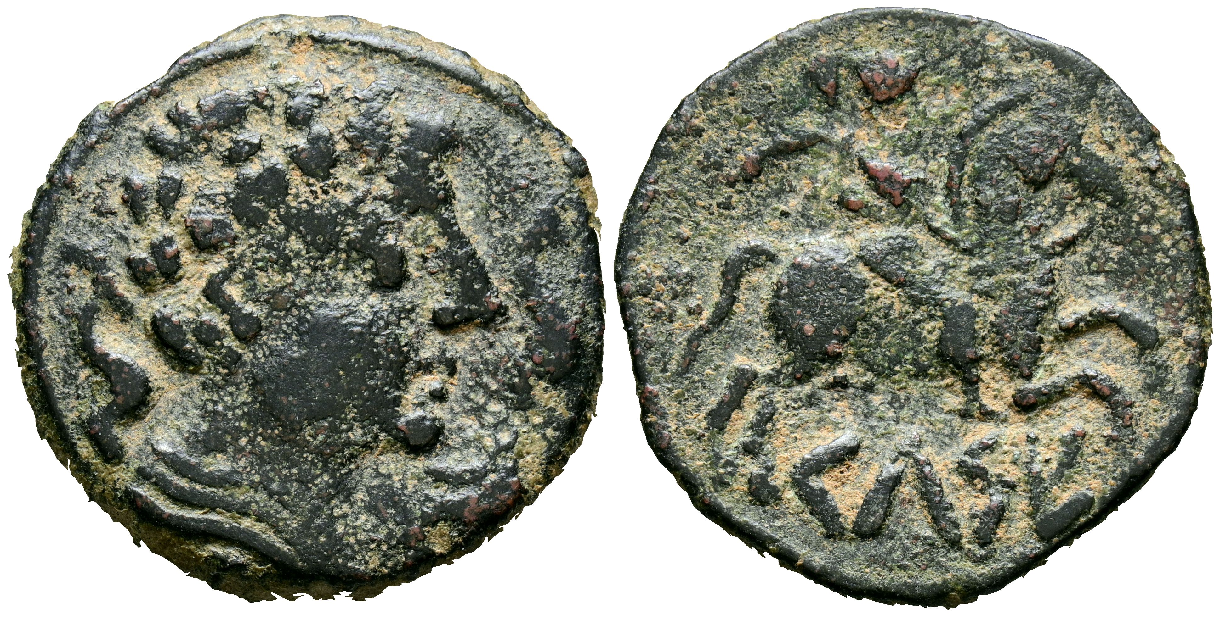 CELSE (Velilla del Ebro, Zaragoza). As. (Ae. 12.29g/27mm). 120-50 Fine (FAB-771). Anv: Head to right with cloak and fibula to right, around three dolphins. Reverse: Horseman with palm to right, below Iberian legend on line: CeLSE. VF.