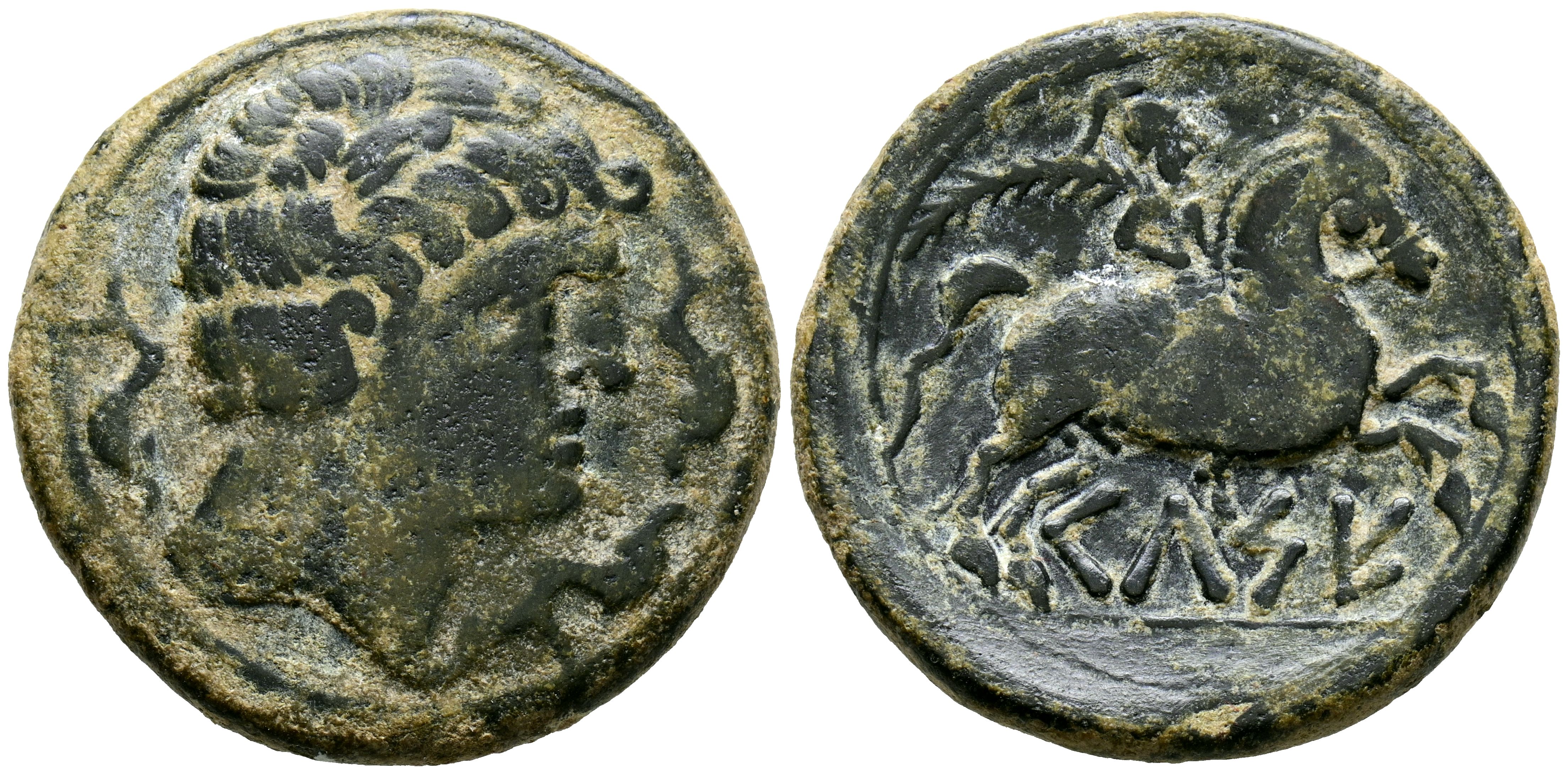 CELSE (Velilla de Ebro, Zaragoza). As. (Ae. 16.41g/31mm). 120-50 Fine (FAB-771). Anv: Male head right with cloak and fibula, around three dolphins. Reverse: Horseman with palm to the right, below Iberian legend on line: CeLSE. Very Fine-.
