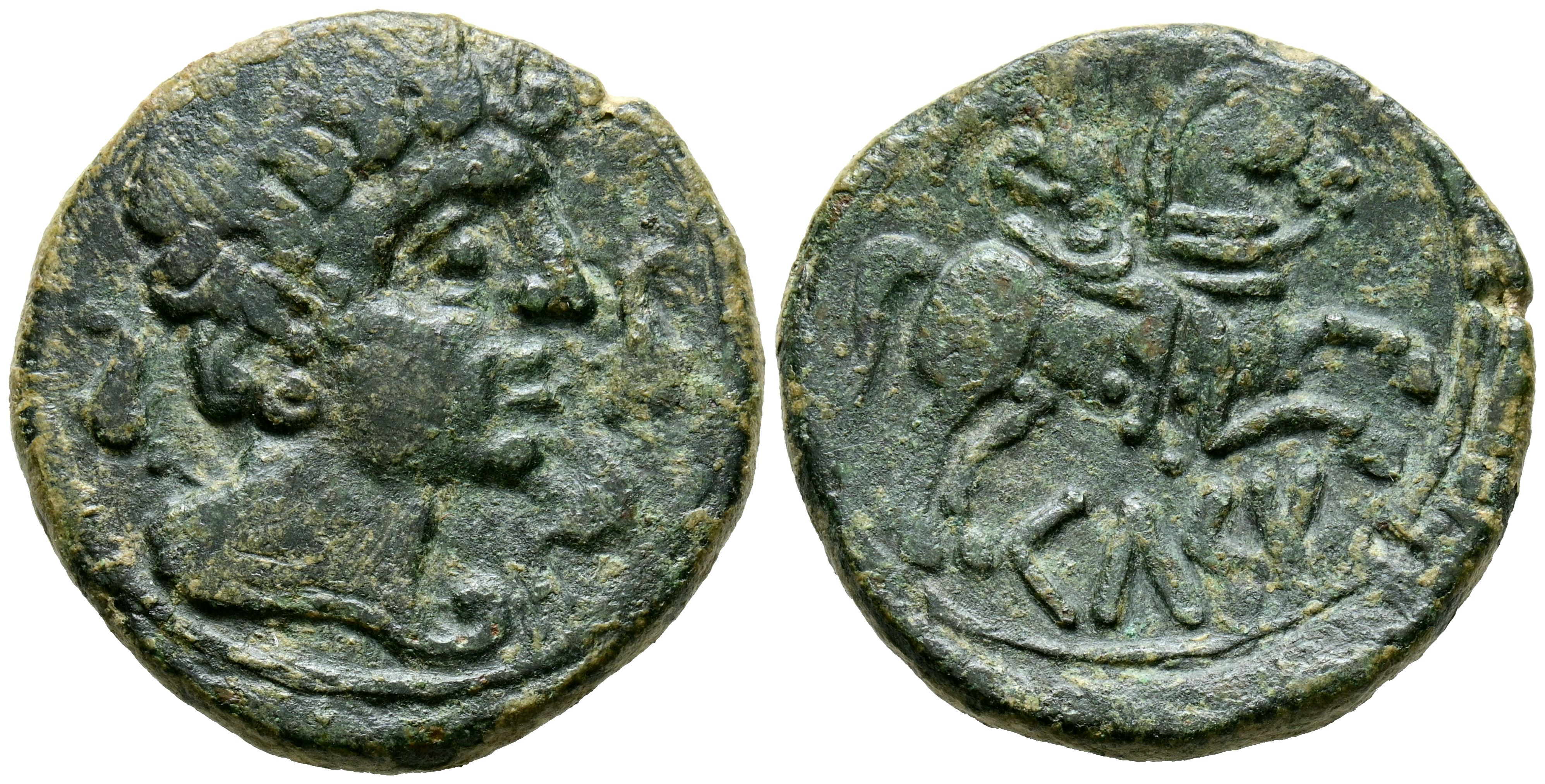 CELSE (Velilla de Ebro, Zaragoza). As. (Ae. 12.23g/28mm). 120-50 Fine (FAB-771). Anv: Male head right with cloak and fibula, around three dolphins. Reverse: Horseman with palm to the right, below Iberian legend on line: CeLSE. VF.
