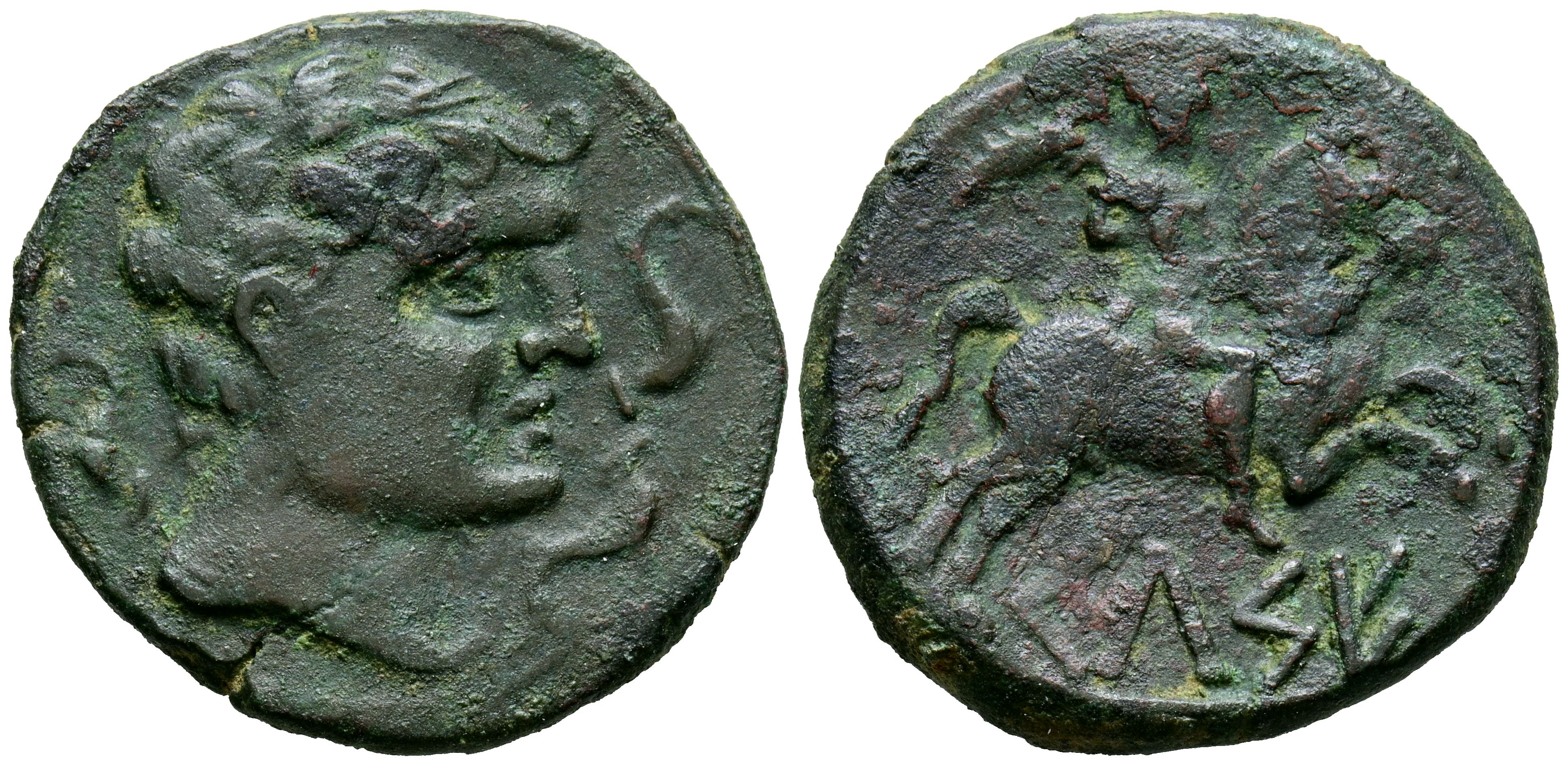 CELSE (Velilla de Ebro, Zaragoza). As. (Ae. 10.12g/27mm). 120-50 Fine (FAB-771). Anv: Male head right with cloak and fibula, around three dolphins. Reverse: Horseman with palm to the right, below Iberian legend on line: CeLSE. Very Fine-.