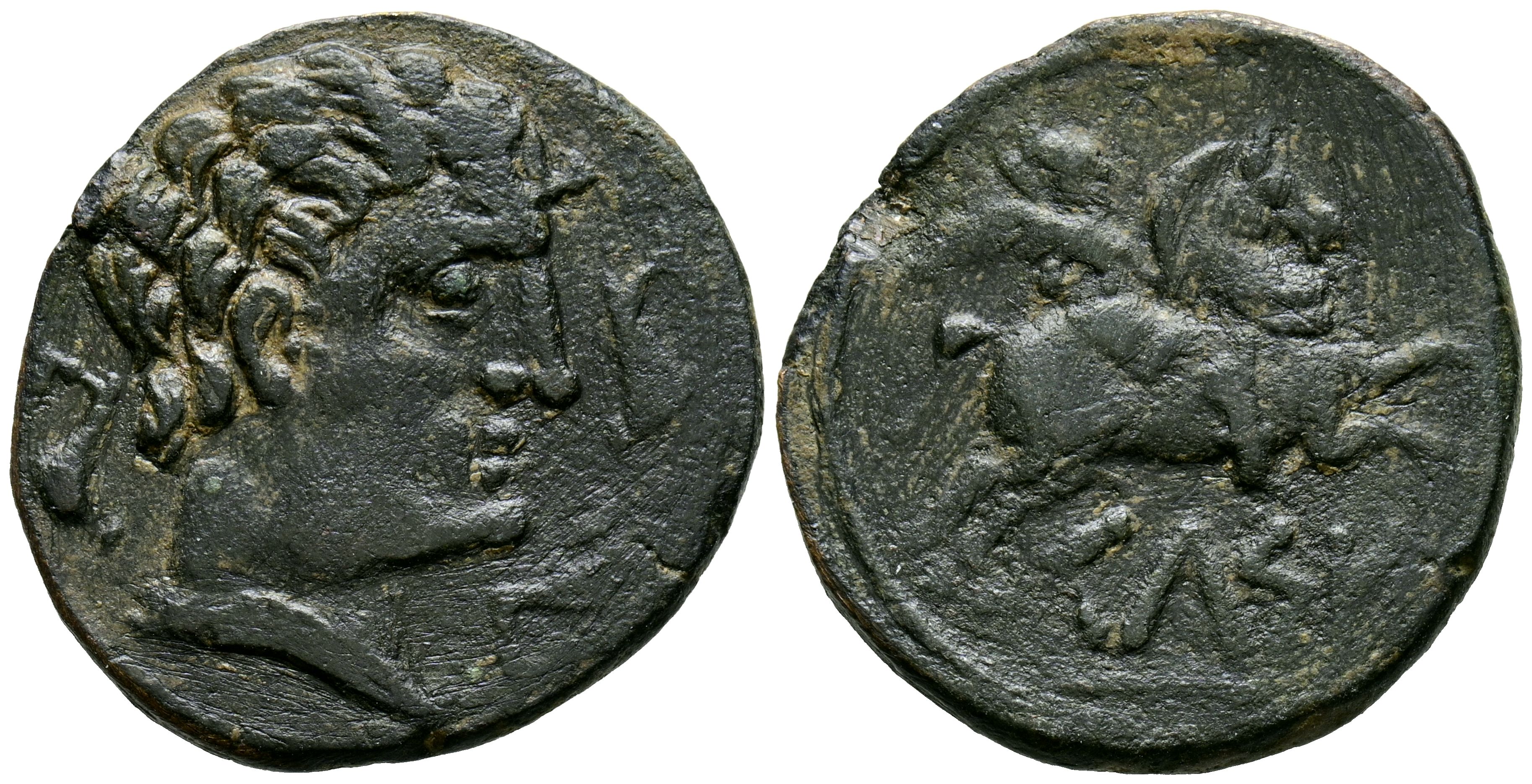 CELSE (Velilla del Ebro, Zaragoza). As. (Ae. 8.10g/27mm). 120-50 Fine (FAB-771). Anv: Head to right with cloak and fibula to right, around three dolphins. Reverse: Horseman with palm to right, below Iberian legend on line: CeLSE. Very Fine/Very Fine-.