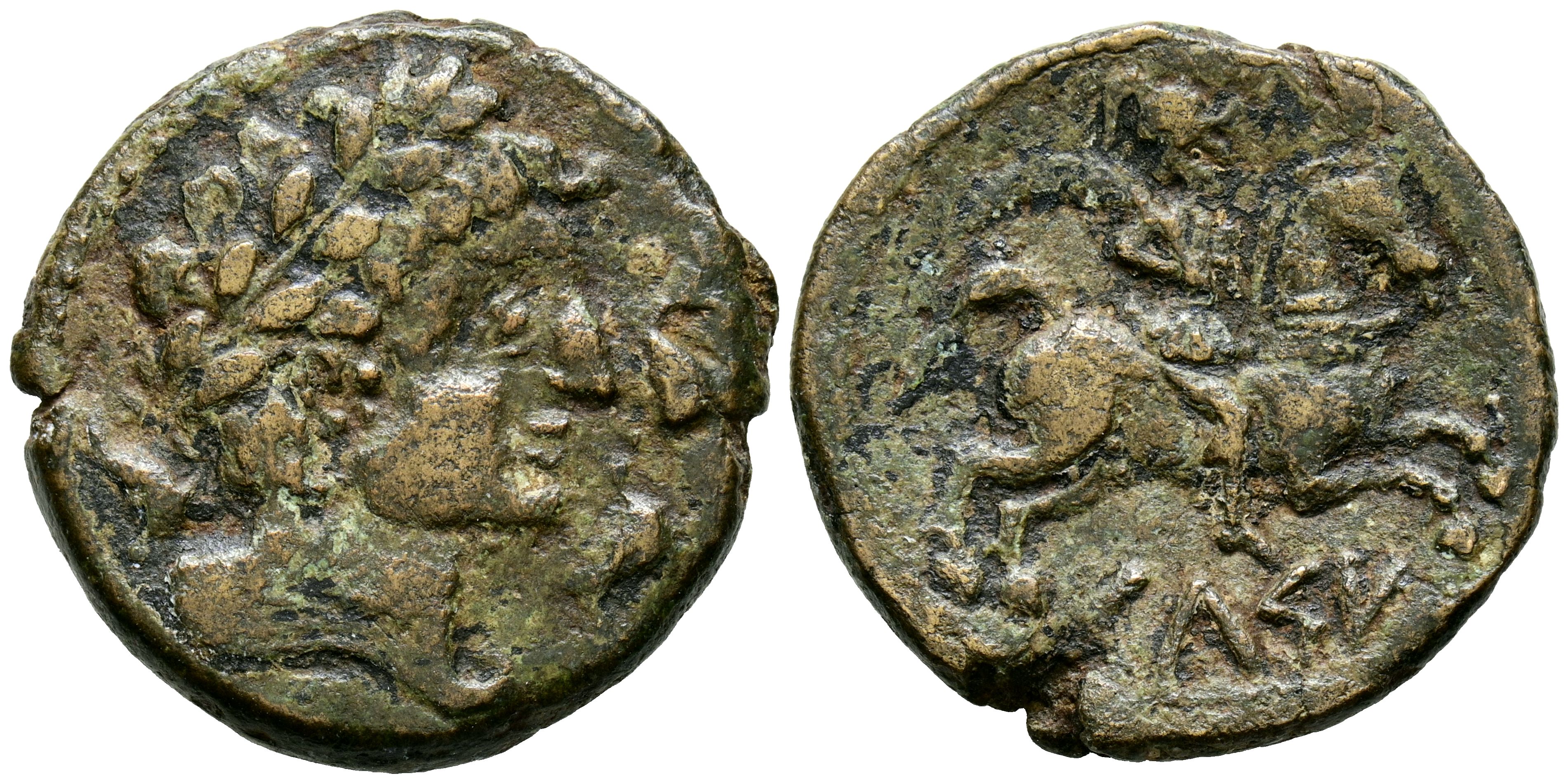 English CELSE (Velilla del Ebro, Zaragoza). As. (Ae. 9.69g/27mm). 120-50 Fine (FAB-776). Obv: Laureate male head right, around three dolphins. Reverse: Horseman with palm to the right, below Iberian legend CeLSE. VF.