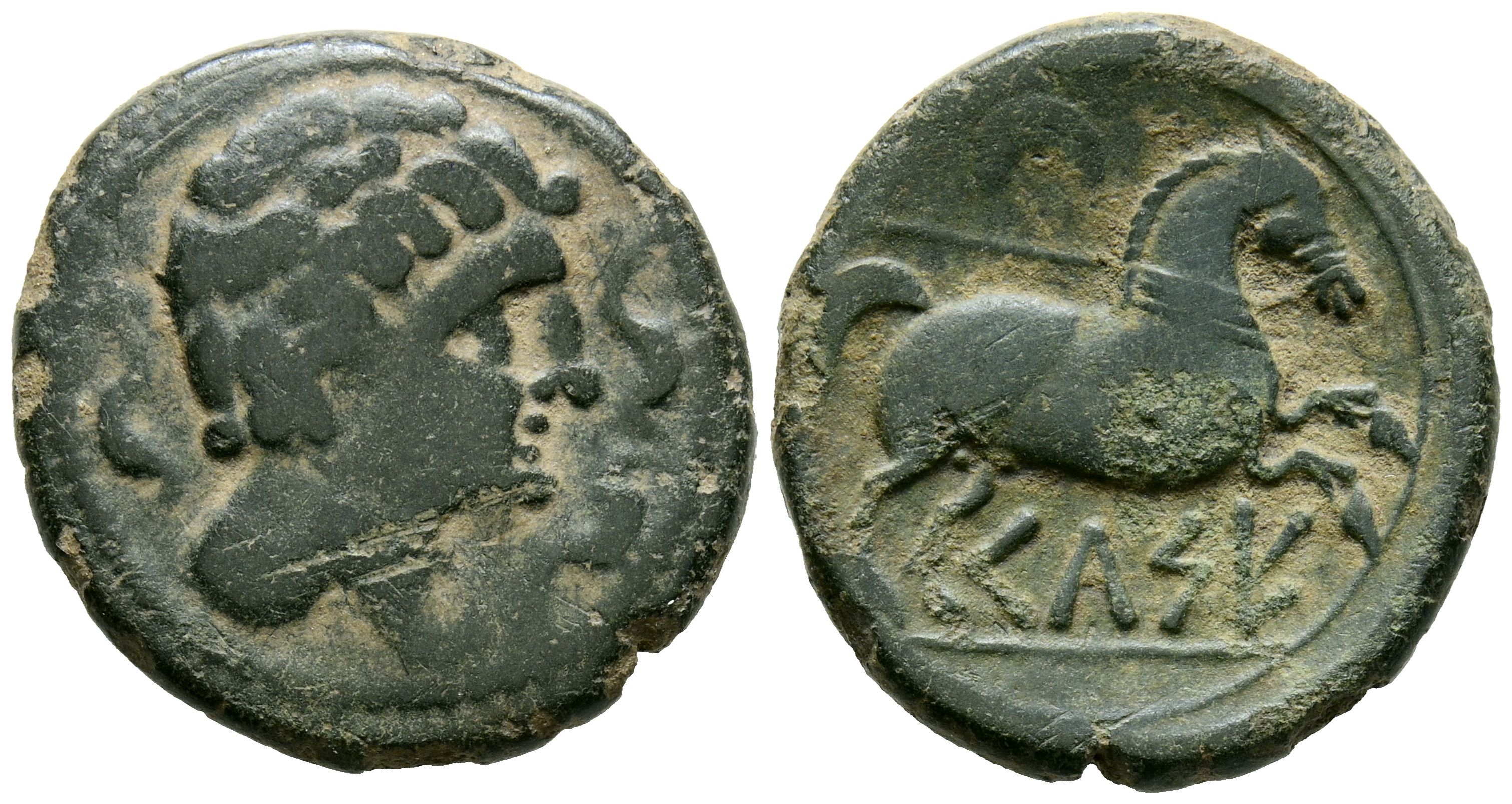 English CELSE (Velilla del Ebro, Zaragoza). Semis. (Ae. 6.43g/22mm). 120-50 Fine (FAB-782). Anv: Male head facing right surrounded by three dolphins. Rev: Horse with bridle facing right, crescent above, below Iberian legend above line: CeLSE. Very Fine-.