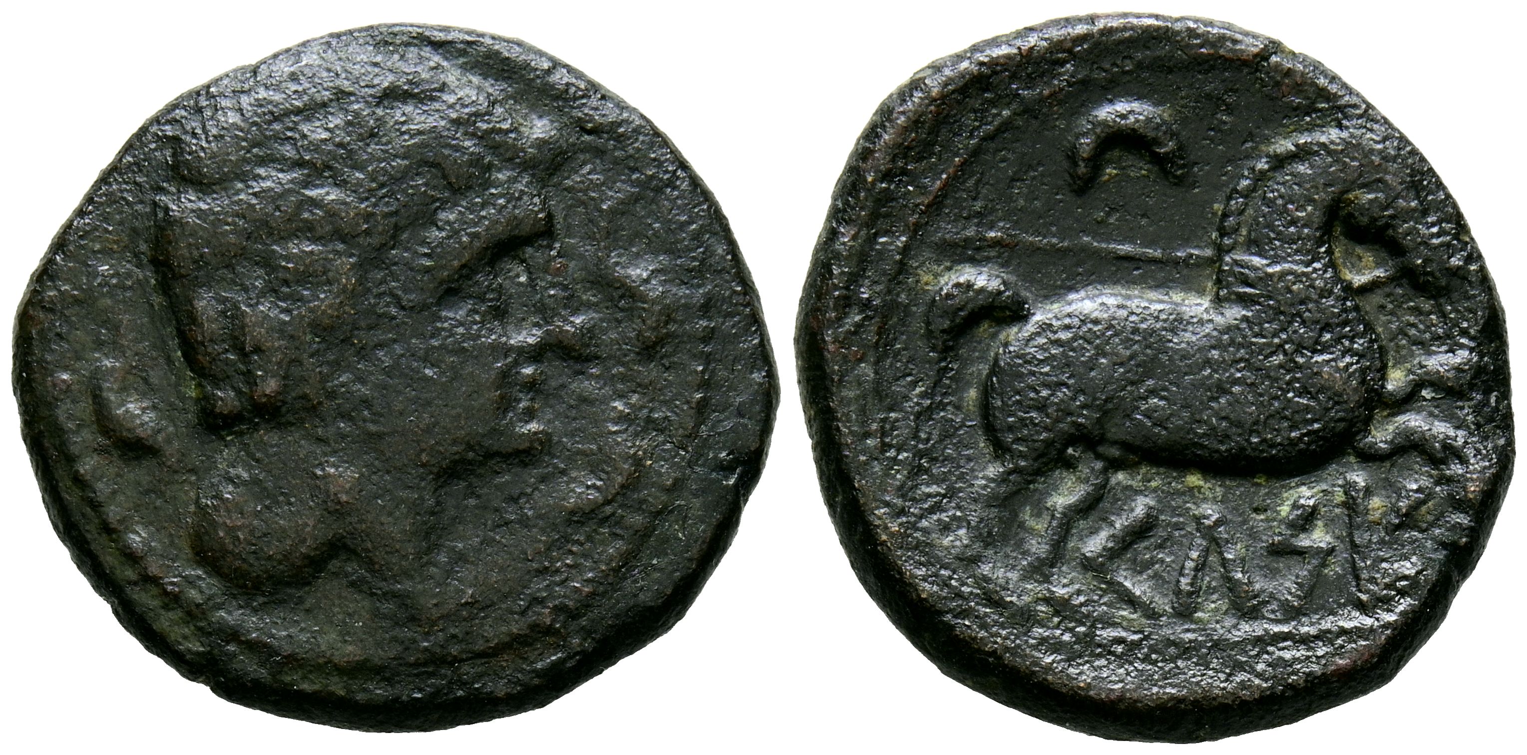 CELSE (Velilla del Ebro, Zaragoza). Semis. (Ae. 5.66g/22mm). 120-50 Fine (FAB-782). Anv: Male head facing right surrounded by three dolphins. Rev: Horse with bridle facing right, crescent above, below Iberian legend above line: CeLSE. Very Fine-.