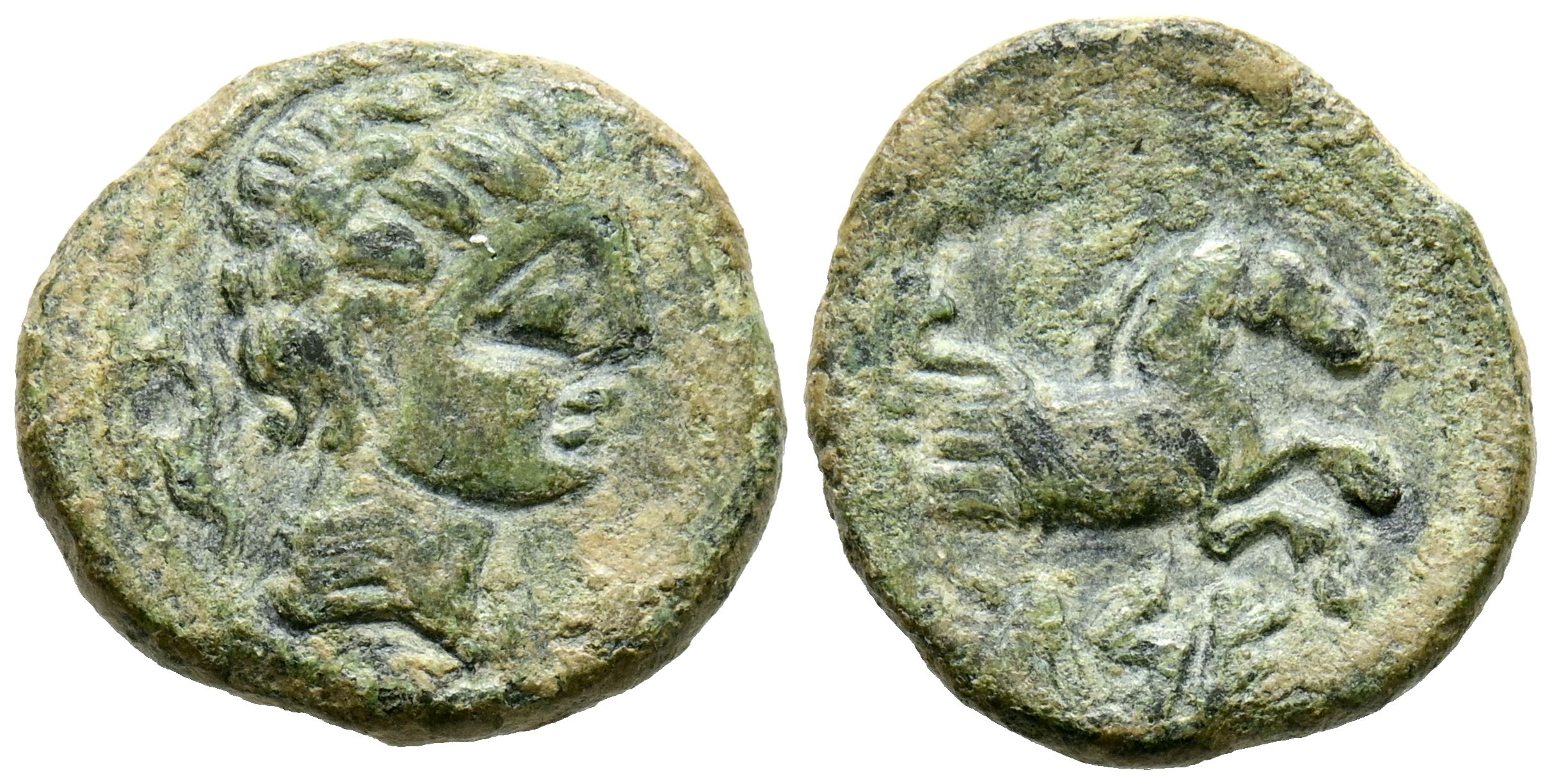 English CELSE (Velilla del Ebro, Zaragoza). Quadrant. (Ae. 2.96g/17mm). 120-50 Fine (FAB-791). Obverse: Male head right, behind dolphin. Reverse: Protomus of Pegasus right, above three dots, below Iberian legend on line: CeLSE. Good Very Fine.