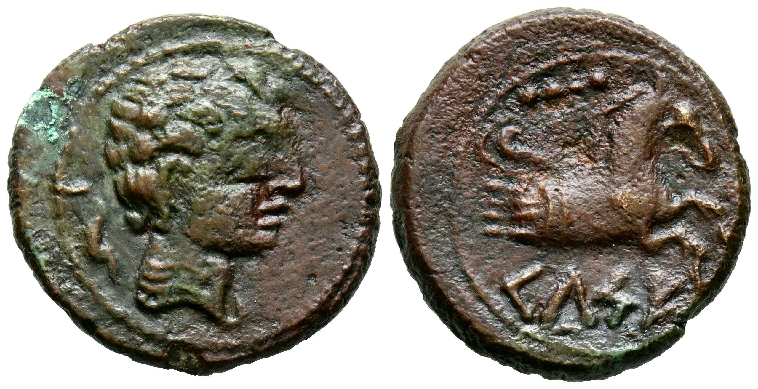 CELSE (Velilla del Ebro, Zaragoza). Quadrant. (Ae. 3.70g/18mm). 120-50 Fine (FAB-791). Obverse: Male head right, behind dolphin. Reverse: Protomus of Pegasus right, above three dots, below Iberian legend on line: CeLSE. Good Very Fine.