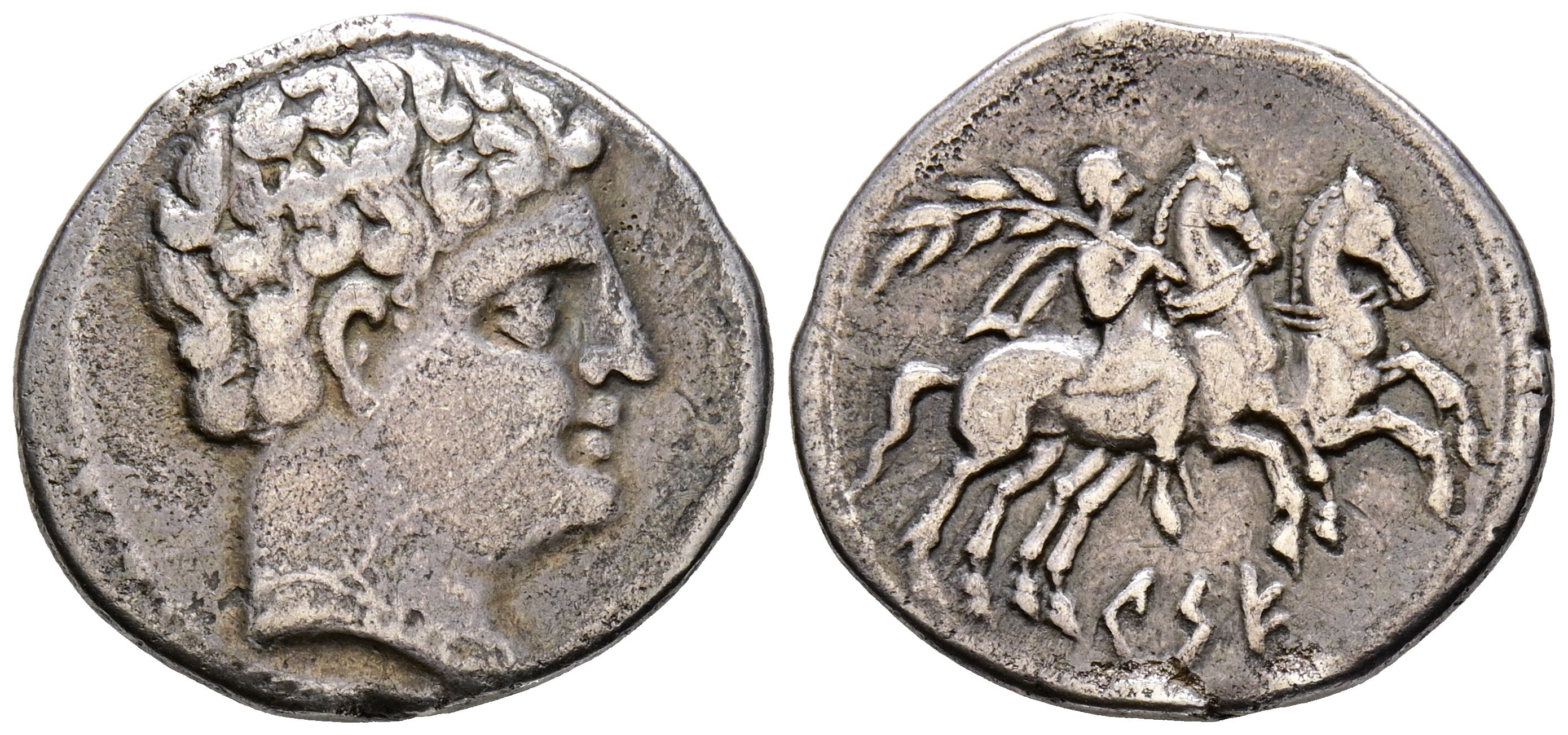 CESE (Tarragona). Denarius. (Ar. 3.69g/19mm). 120-20 Fine (FAB-2266). Obv: Male head to right. Rev: Rider with palm to right leading second horse, below Iberian legend on line: CeSE. Very Fine-.