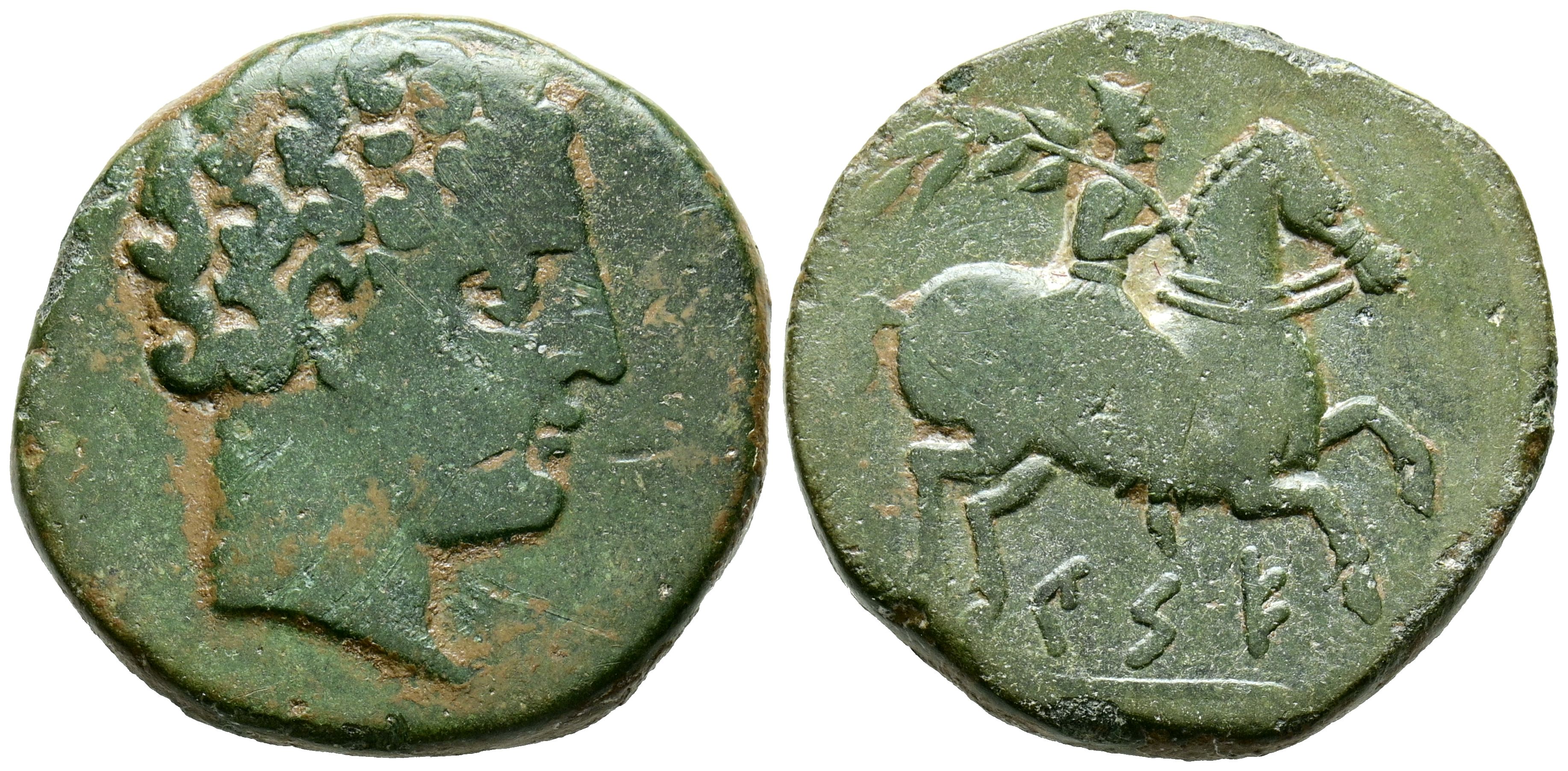 English CESE (Tarragona). As. (Ae. 11.41g/26mm). 120-20 Fine (FAB-2270). Anv: Male head right. Rev: Horseman with palm to the right, below Iberian legend: CeSE. VF. Green patina.