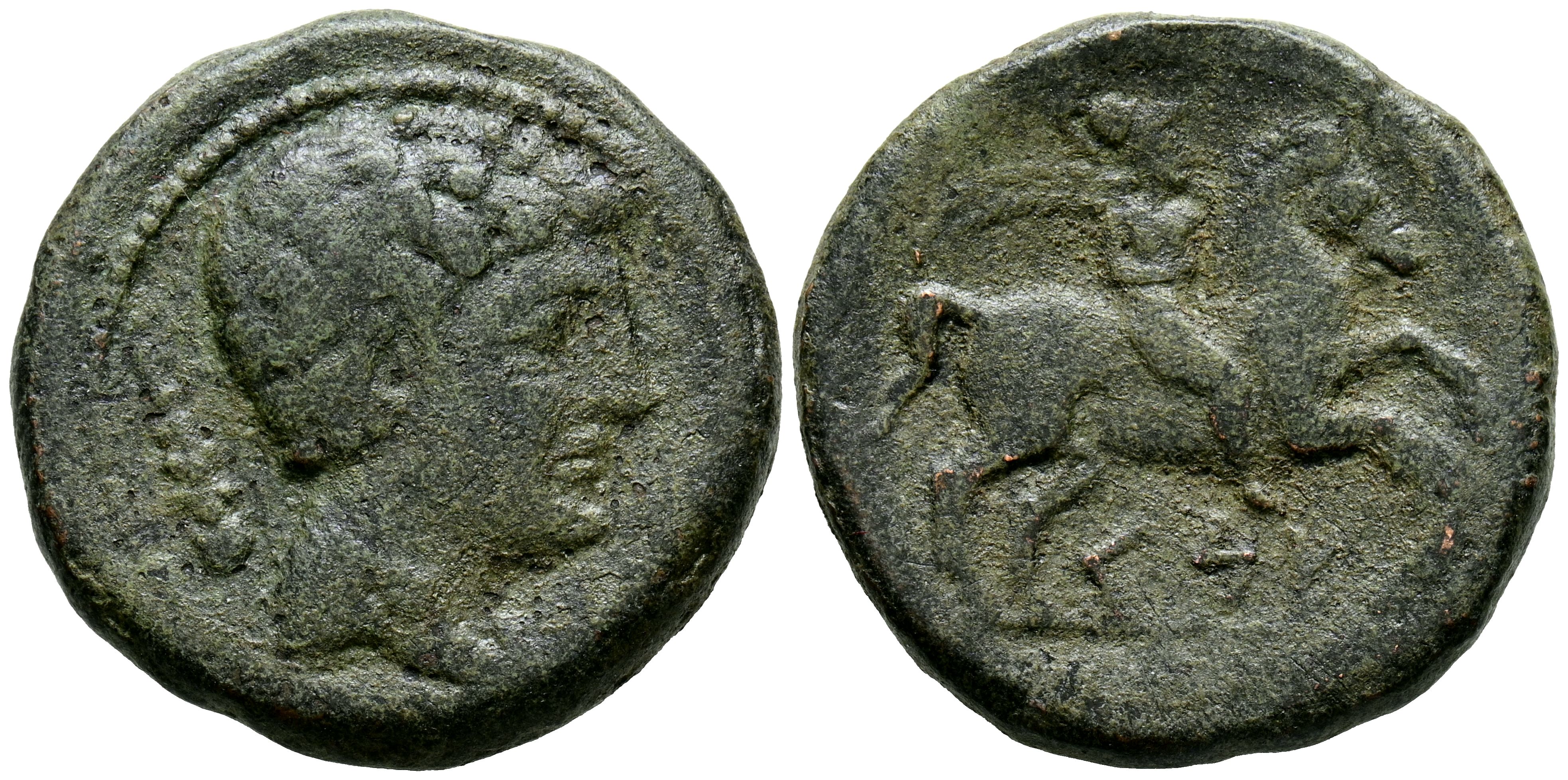 CESE (Tarragona). As. (Ae. 13.88g/27mm). 120-20 Fine (FAB-2277). Anv: Male head to the right, club behind. Rev: Horseman with palm to the right, below Iberian legend: CeSE. Very Fine.
