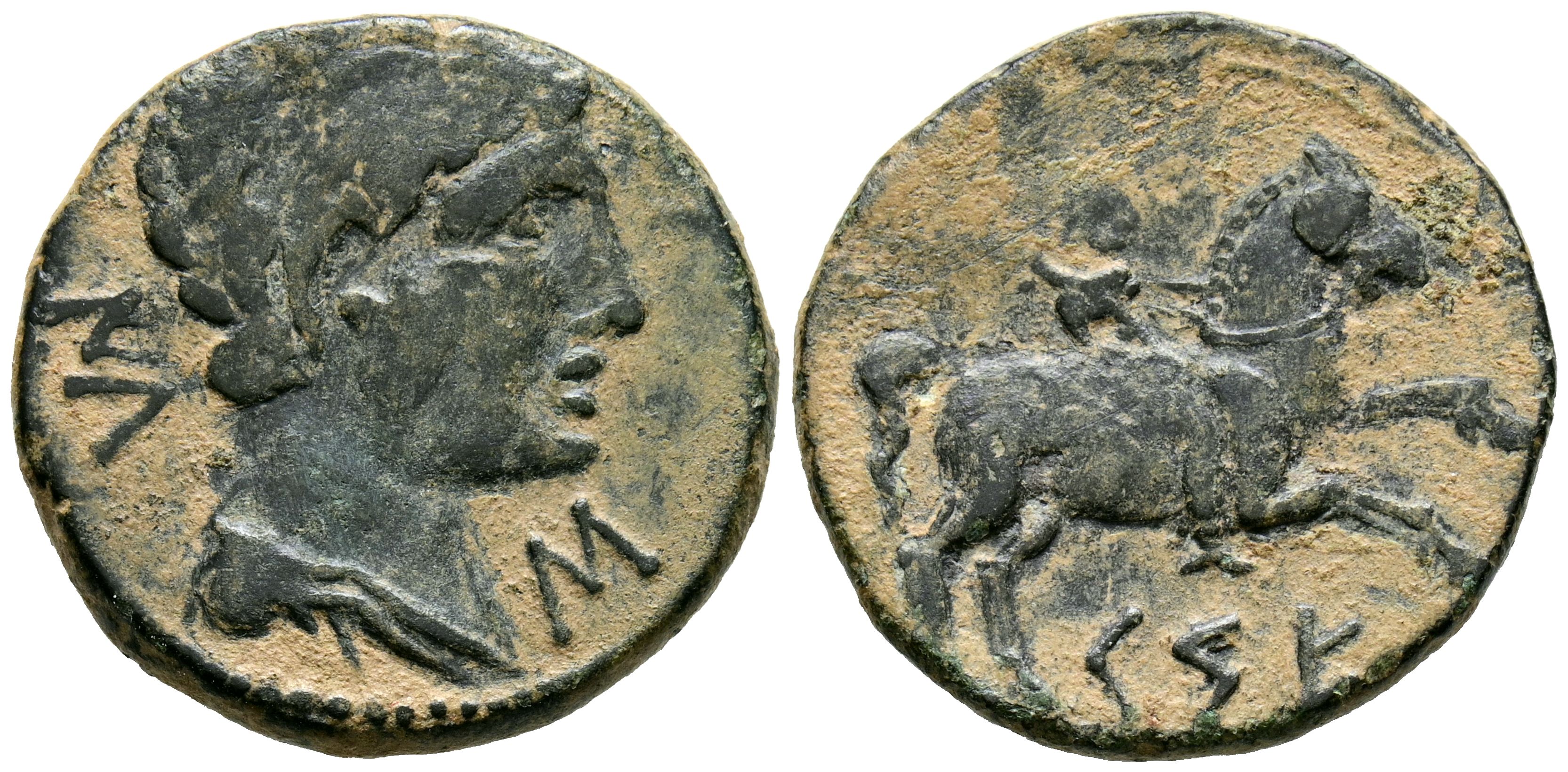 English CESE (Tarragona). As. (Ae. 6.78g/23mm). 120-20 Fine (FAB-2295). Anv: Male head to the right, behind Iberian letters: IL, in front S. Rev: Horseman with palm to the right, below Iberian legend: CeSE. Very Fine-.