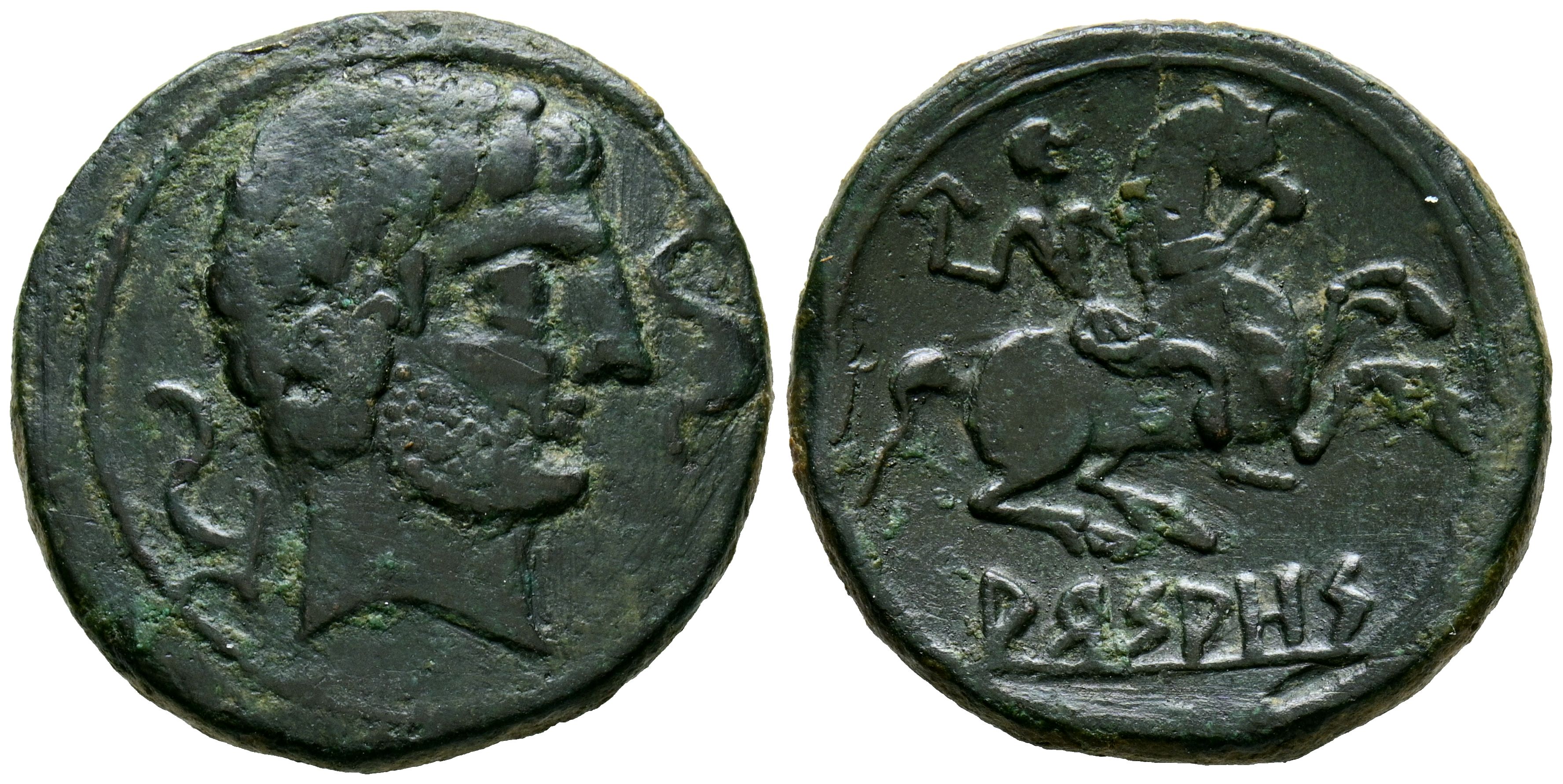 ARSAOS (Navarre area). As. (Ae. 8.49g/25mm). 120-80 Fine (FAB-144). Obverse: Bearded male head to the right, between two dolphins. Reverse: Horseman with dart to the right, below Iberian legend: ARSAOS. VF. Lowered fields.