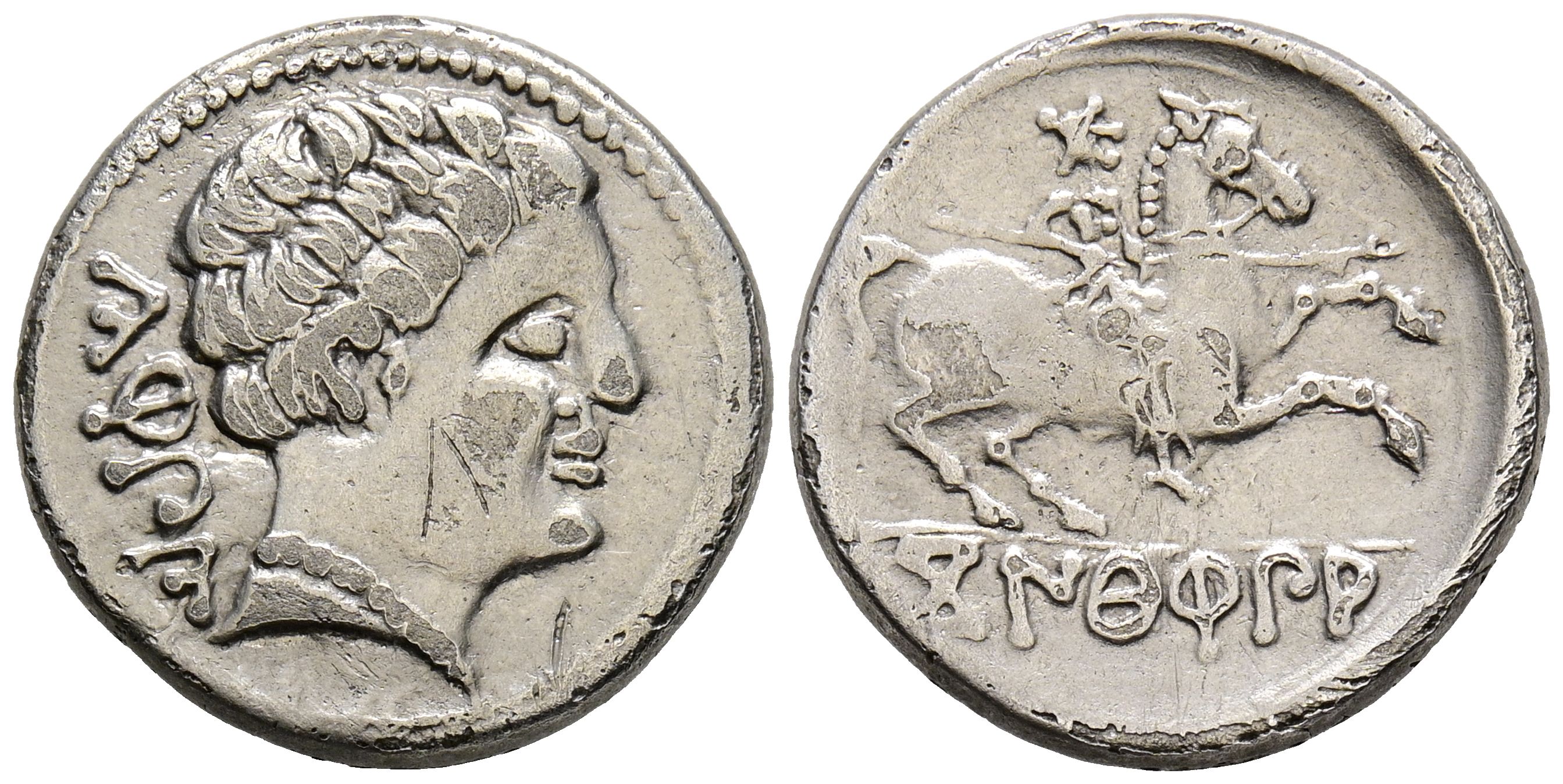 CONTERBIA CARBICA (Huete, Cuenca). Denarius. (Ar. 4.00g/19mm). 120-80 Fine (FAB-845). Obv: Male head to right, behind legend: CaRBICA. Rev: Horseman with lance to right, below Iberian legend under legend: CoNTERBiA. VF. Scarce.