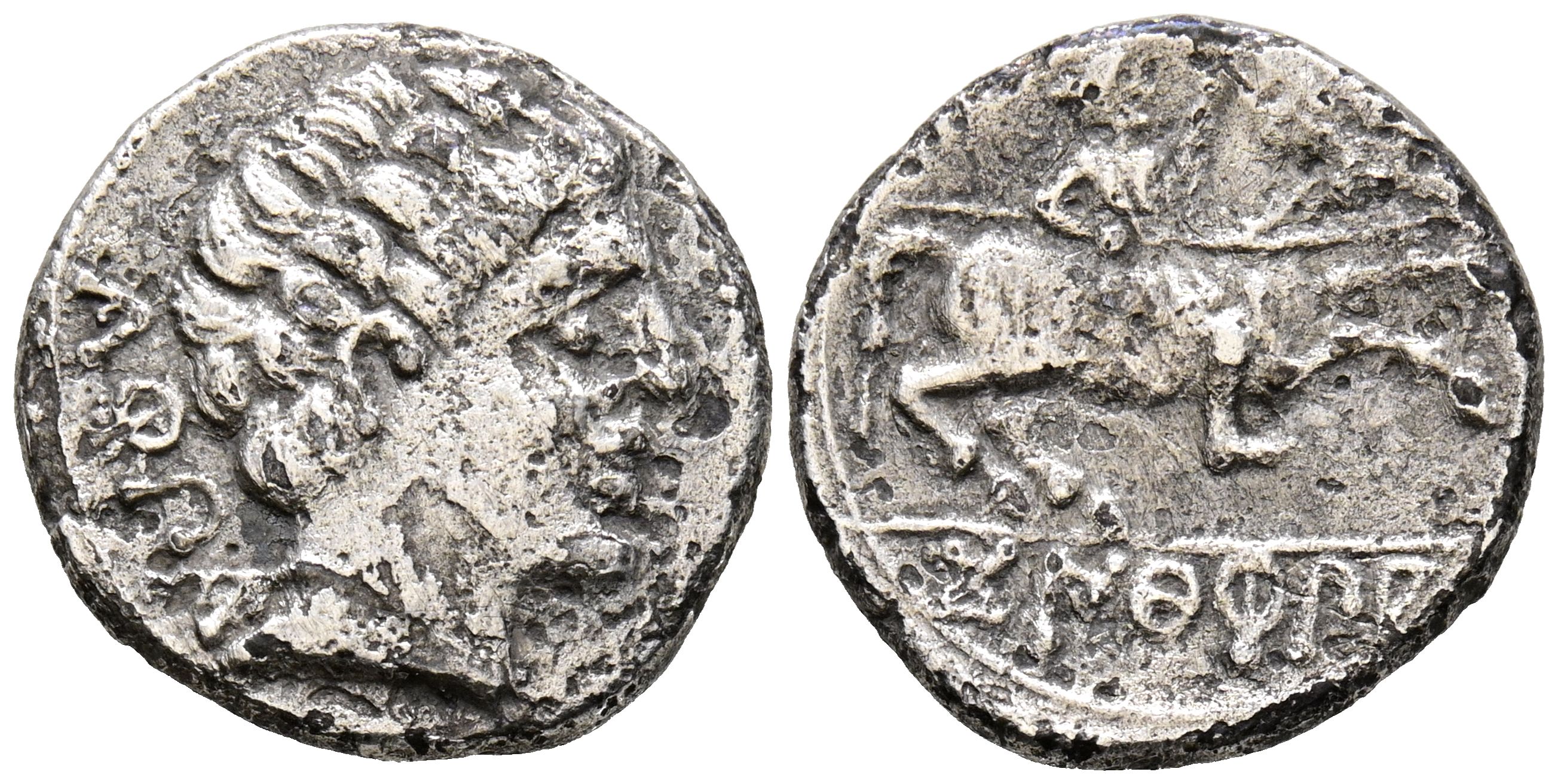 CONTERBIA CARBICA (Huete, Cuenca). Denarius. (Ar. 3.26g/17mm). 120-80 Fine (FAB-845). Obv: Male head to right, behind legend: CaRBICA. Rev: Horseman with lance to right, below Iberian legend under legend: CoNTERBiA. VF-. Cleaned oxidations. Scarce specimen.