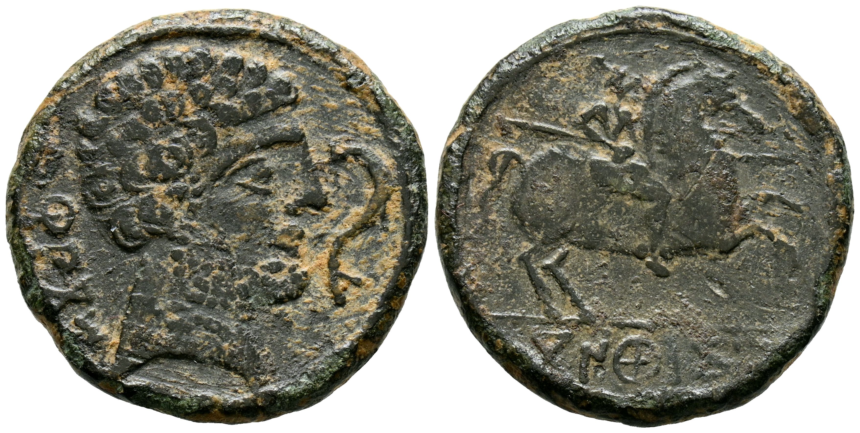 English CONTERBIA CARBICA (Huete, Cuenca). As. (Ae. 8.15g/25mm). 120-80 Fine (FAB-846). Anv: Male head to right, behind legend: CaRBiCa, in front dolphin. Rev: Horseman with lance to right, below Iberian legend below line: CoNTeBaCoM. VF.