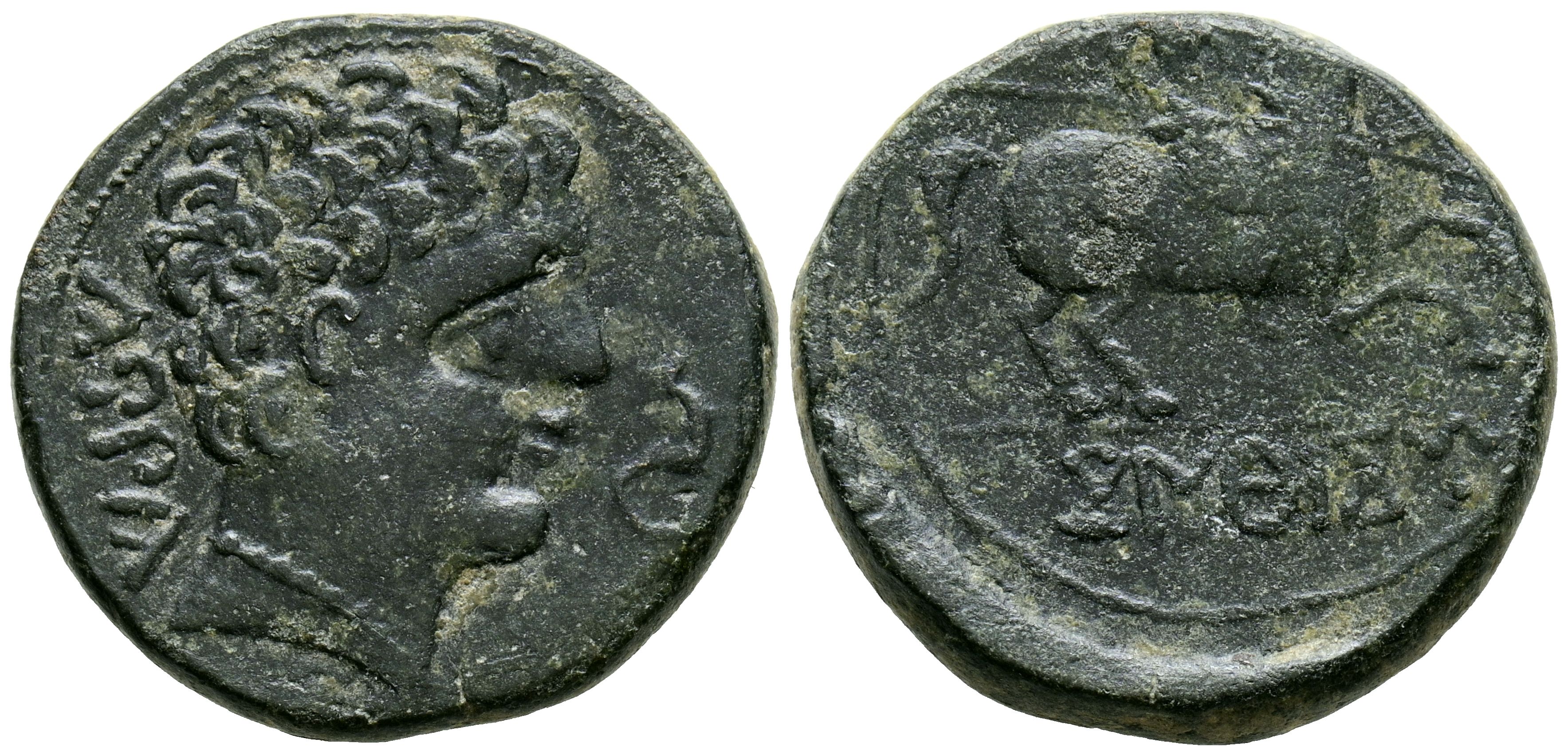 CONTERBIA CARBICA (Huete, Cuenca). As. (Ae. 10.54g/24mm). 120-80 Fine (FAB-846). Anv: Male head to the right, behind legend: CaRBiCa, in front dolphin. Rev: Horseman with lance to the right, below Iberian legend below line: CoNTeBaCoM. Very Fine/Very Fine-.