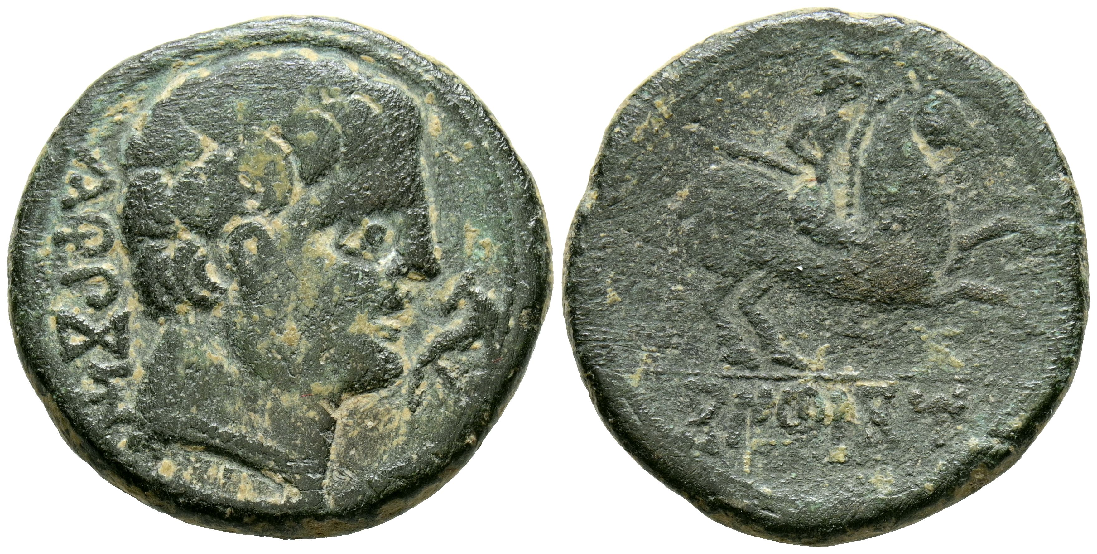 CONTERBIA CARBICA (Huete, Cuenca). As. (Ae. 9.09g/25mm). 120-80 Fine (FAB-846). Anv: Male head to the right, behind legend: CaRBiCa, in front dolphin. Rev: Horseman with lance to the right, below Iberian legend below line: CoNTeBaCoM. VF-.