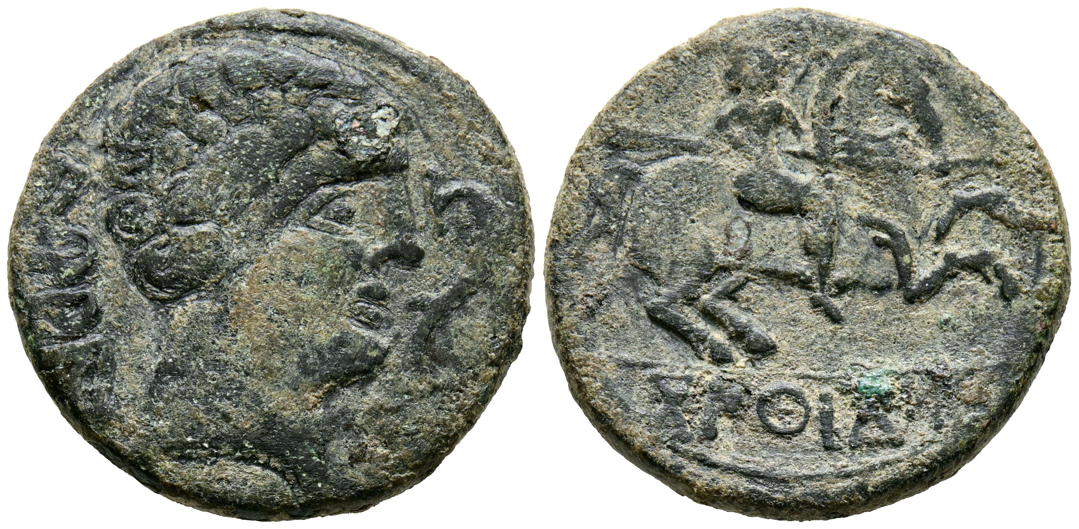 CONTERBIA CARBICA (Huete, Cuenca). As. (Ae. 8.13g/23mm). 120-80 Fine (FAB-846). Anv: Male head to right, behind legend: CaRBiCa, in front dolphin. Rev: Horseman with lance to right, below Iberian legend below line: CoNTeBaCoM. Good Fine.