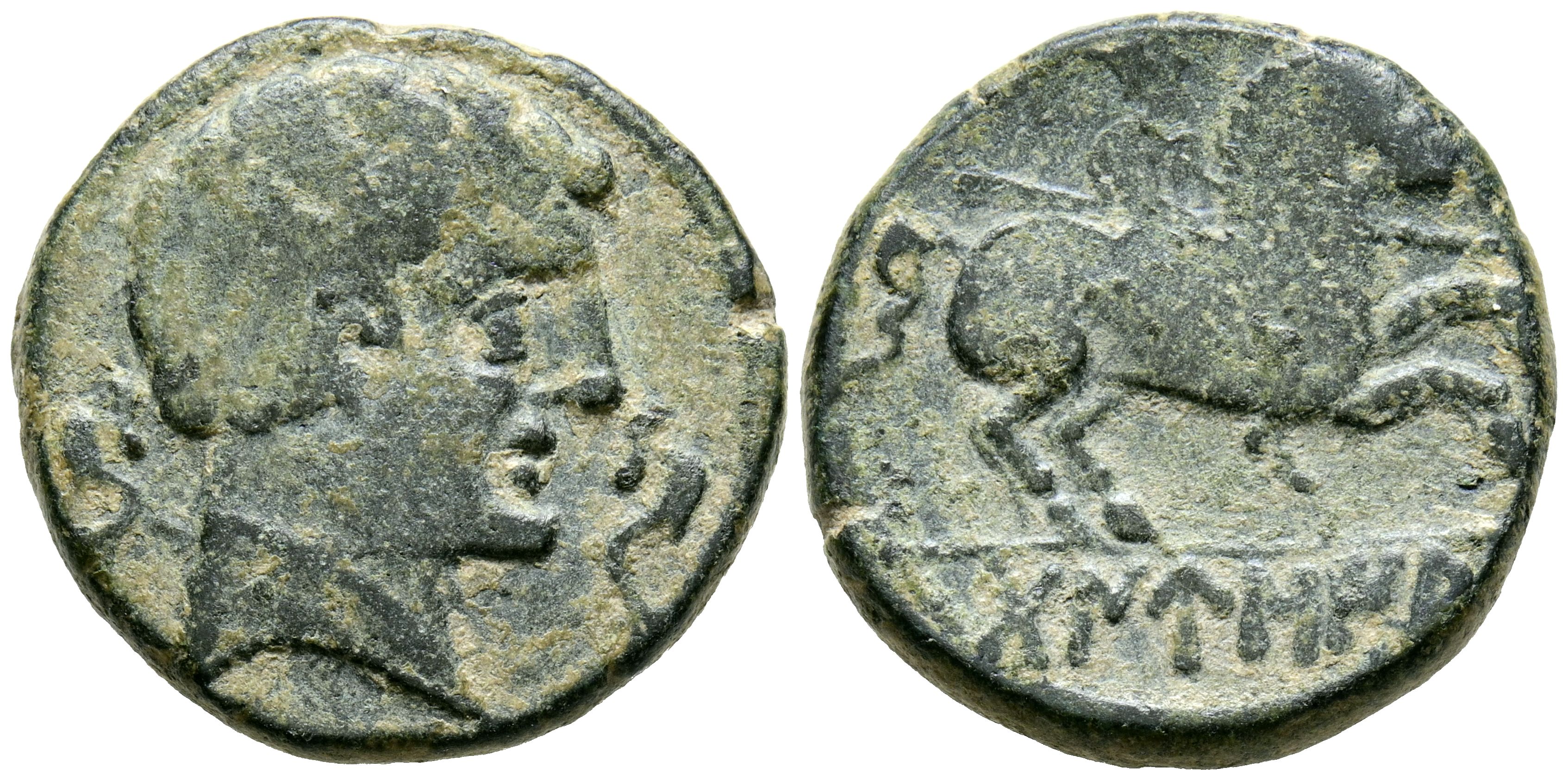 DANUSIA (Bojita, Cáceres). As. (Ae. 9.53g/24mm). 120-20 Fine (FAB-894). Obv: Male head to the right, between two dolphins. Rev: Horseman with lance to the right, below Iberian legend below line: DaNUSIA. VF-.