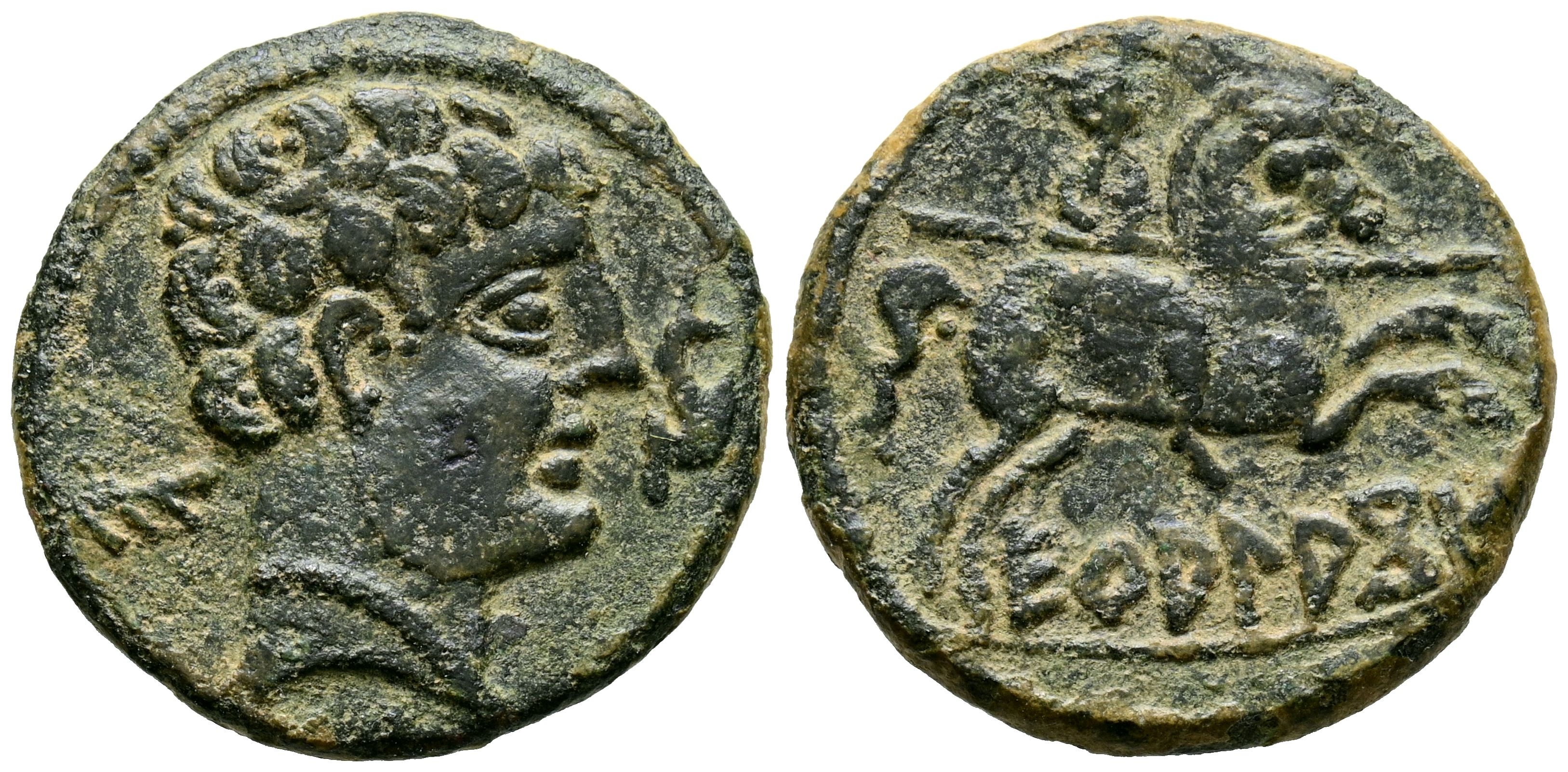 ECUALACOS (Soria-Guadalajara area). As. (Ae. 5.40g/22mm). 120-20 AD (FAB-969). Anv: Male head to the right, in front a dolphin, behind an Iberian letter: E. Rev: Horseman with lance to the right, below legend: ECuALACoS. Very Fine.
